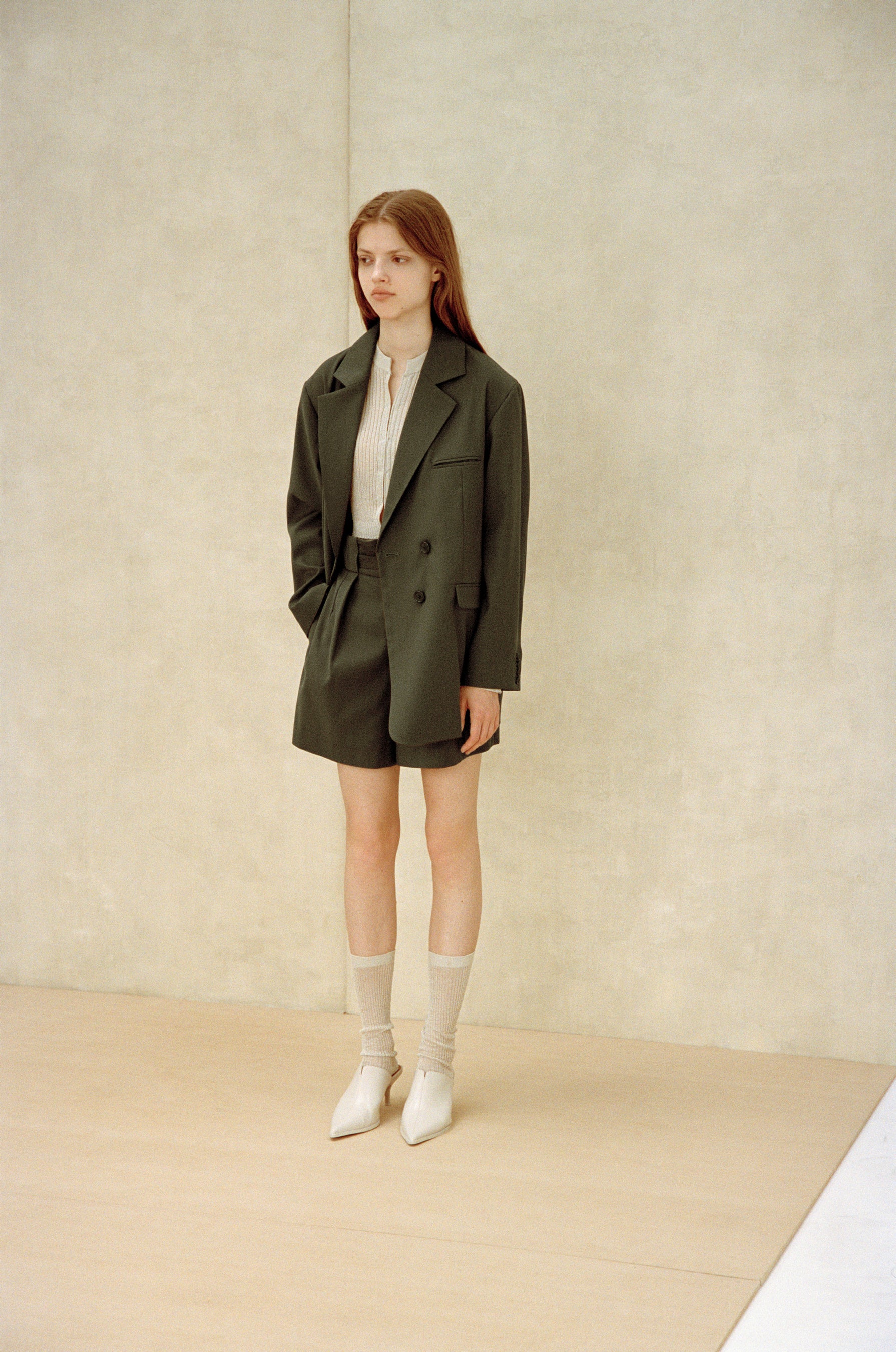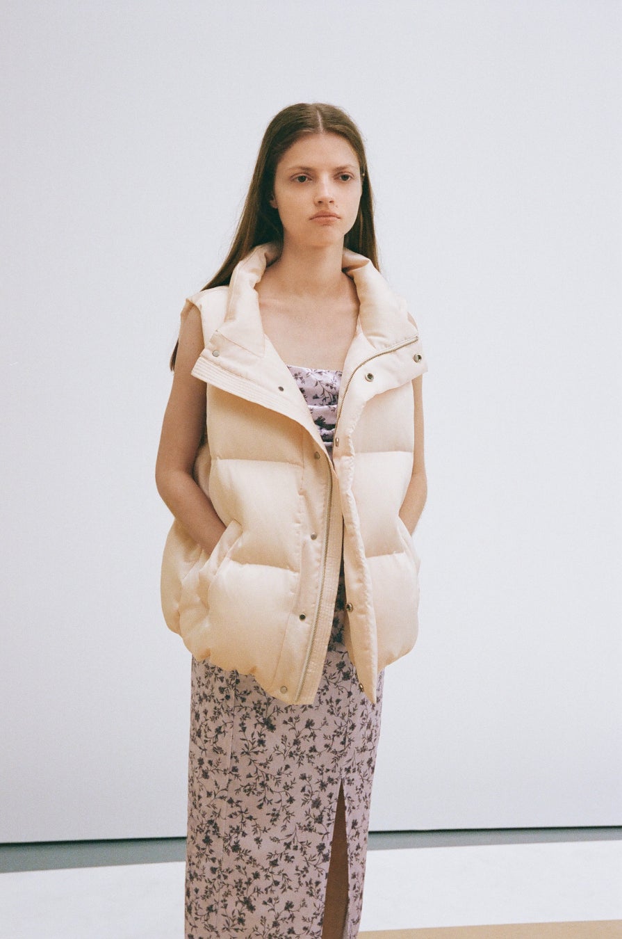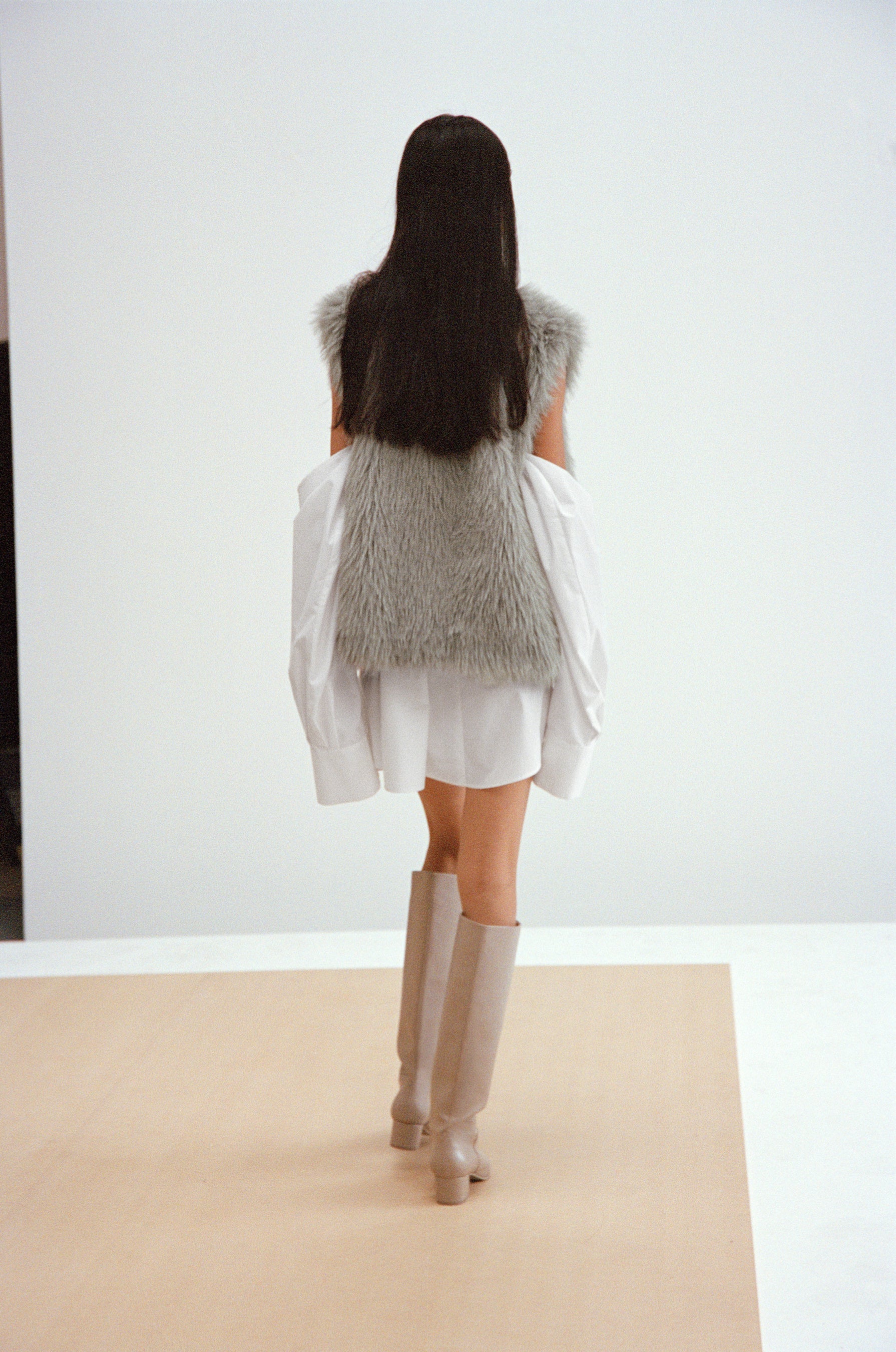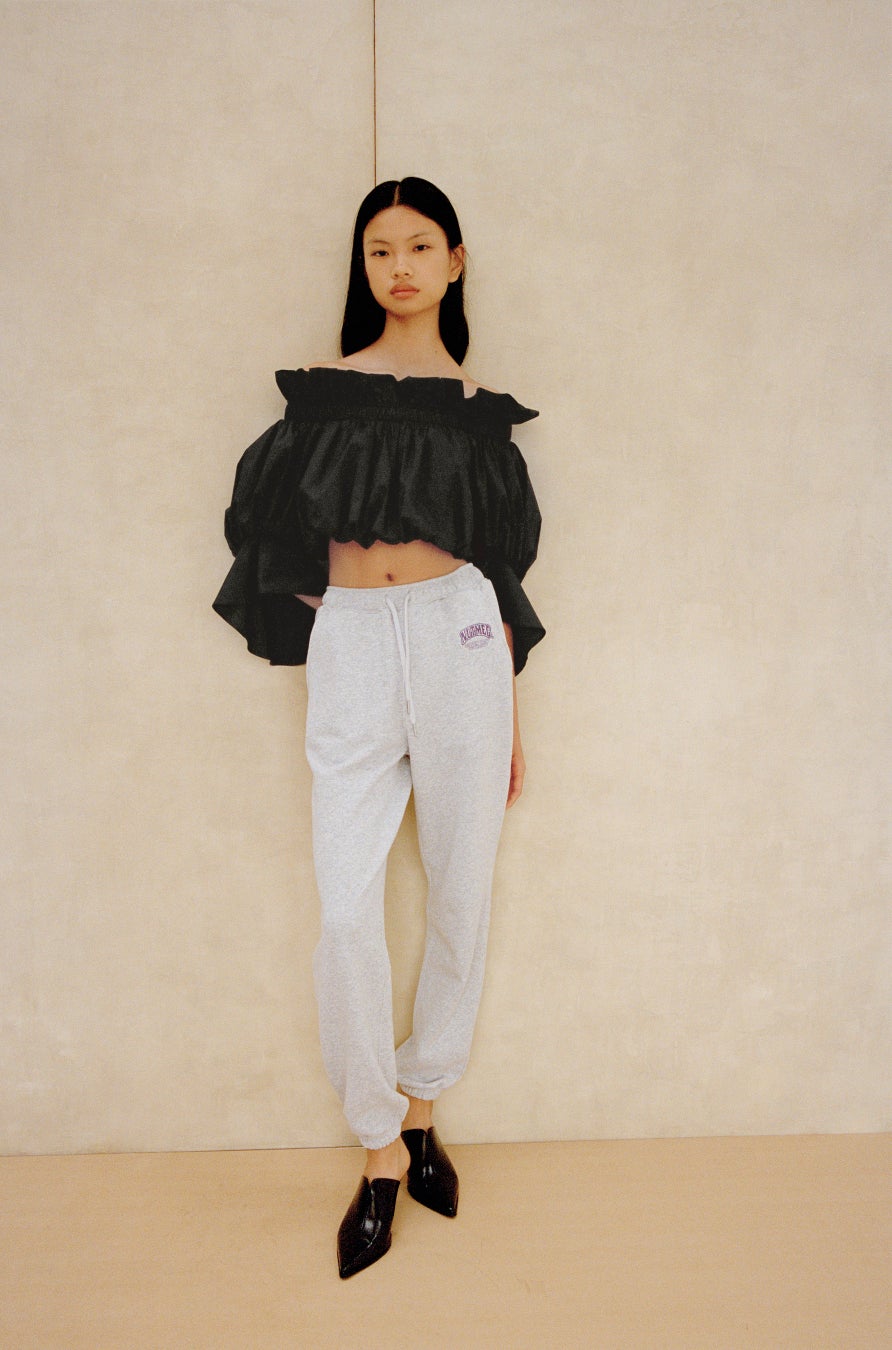 直線的なオフショルダーやタイに、柔らかなドレープ、クロップド丈のバランスなど、