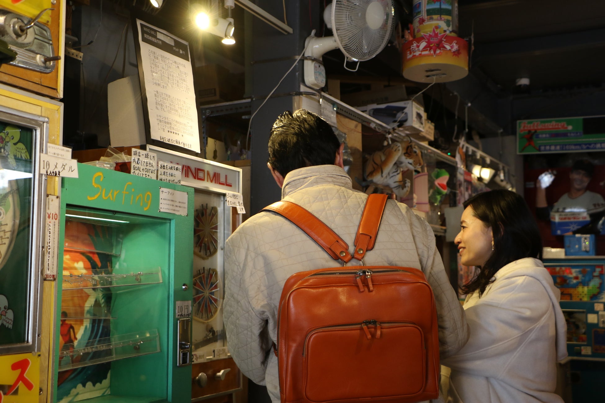 次に、中崎町へ移動してきた2人はレトロな置物やゲーム機がある【エレメカ研究所】に立ち寄ります。三田村も子どもの頃に遊んだことがあるゲーム機を発見し挑戦することに!