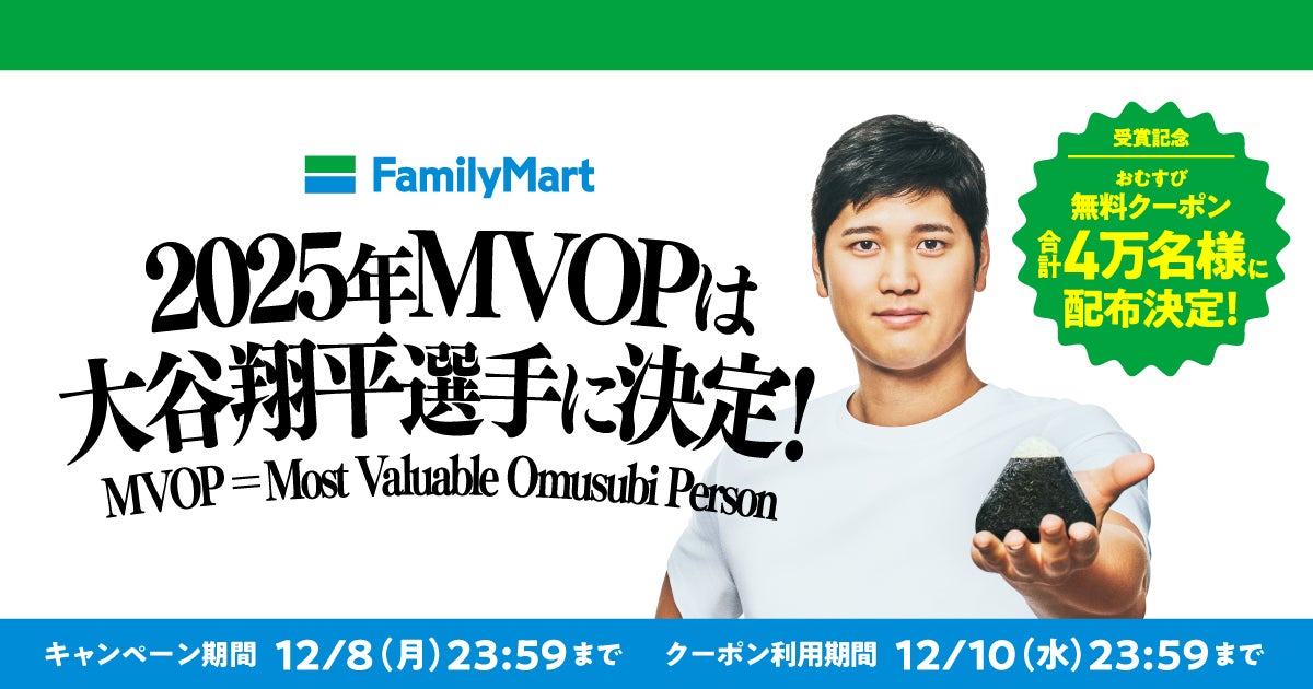 今回、ファミリーマートのおむすびアンバサダーを務める大谷選手が、2025年の「Most Valuable Omusubi Person(モスト バリュアブル オムスビ パーソン/最優秀おむすびパーソン)」に決定。これを記念して、12月5日(金)から、ファミリーマート公式Xアカウントにて「おむすび無料クーポン」を4万名様に配布することをお知らせいたします。