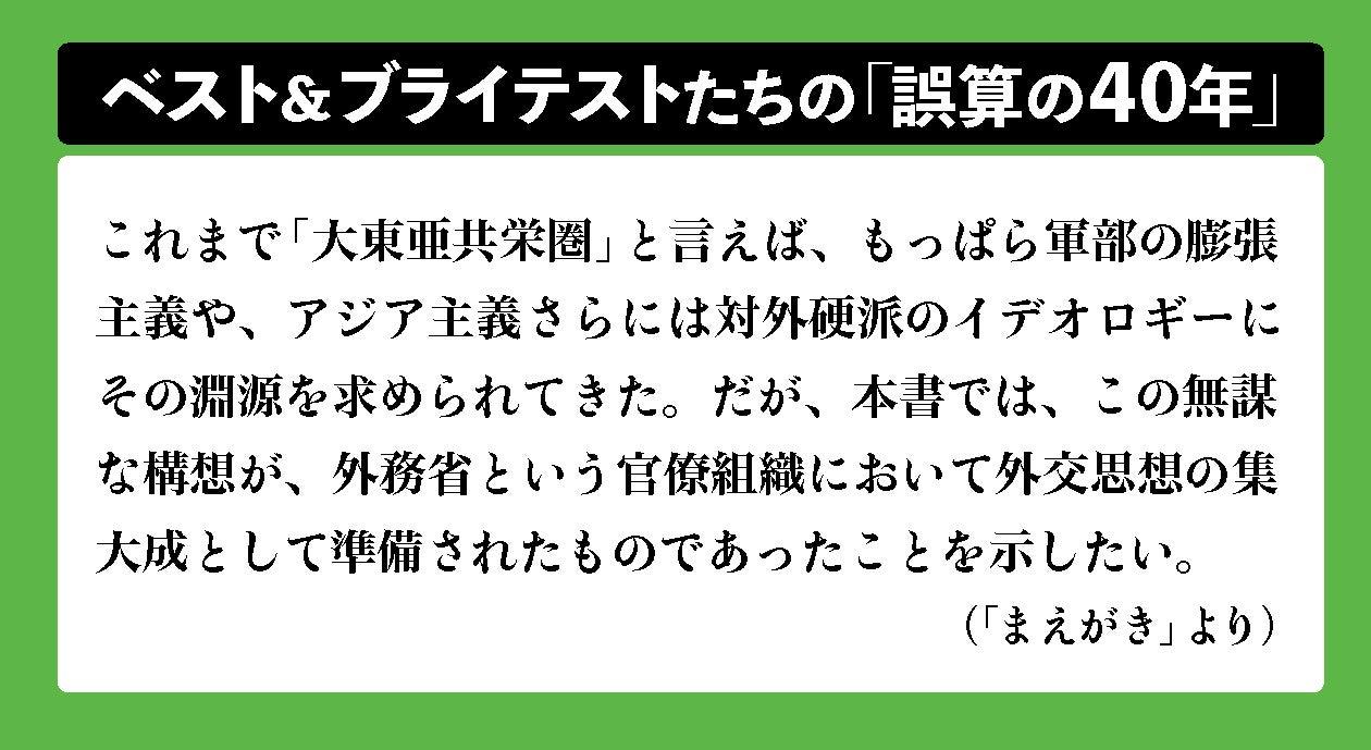 これまで「大東亜共栄圏」と言えば、もっぱら軍部の膨張主義や、アジア主義さらには対外硬派のイデオロギーにその淵源を求められてきた。だが、本書では、この無謀な構想が、外務省という官僚組織において外交思想の集大成として準備されたものであったことを示したい。(「まえがき」より)