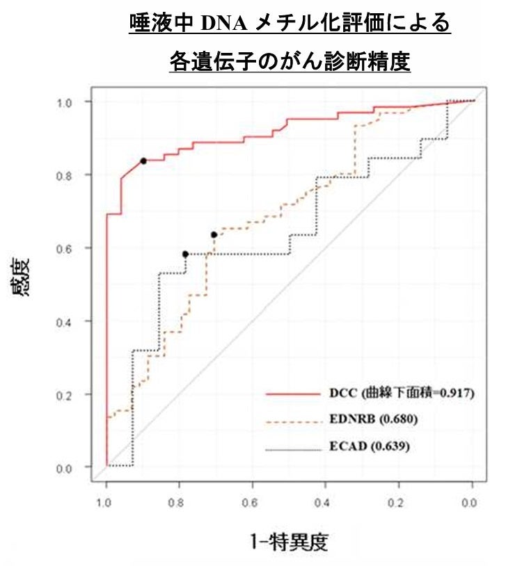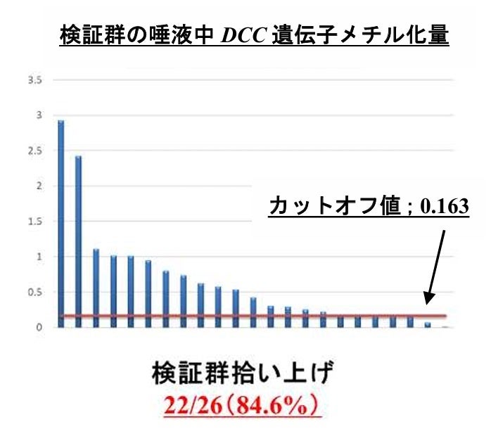 図3. 広島市民病院にて治療された患者さんの唾液(検証群)によるDCC遺伝子メチル化評価のがん診断性能