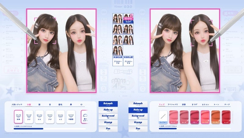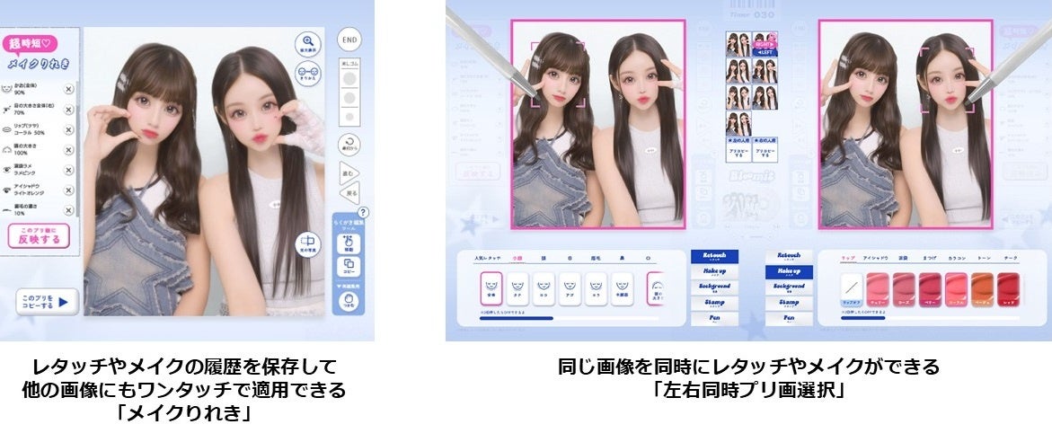 自分の気に入ったレタッチを、1枚ずつに全てを施す作業はどうしても時間がかかってしまいます。そんな苦労を、ワンタッチで解決できる新機能が「メイクりれき」です。レタッチやメイクの選択履歴を保存して、ワンタッチで1枚ずつ反映できるので、大幅な時間短縮に繋がります。さらに、落書き画面で同じ画像を同時にレタッチ・メイクができる「左右同時プリ画選択」も搭載。この機能があれば友達の操作を待つ必要がなくなり、落書き時間をもっと楽しめるように。