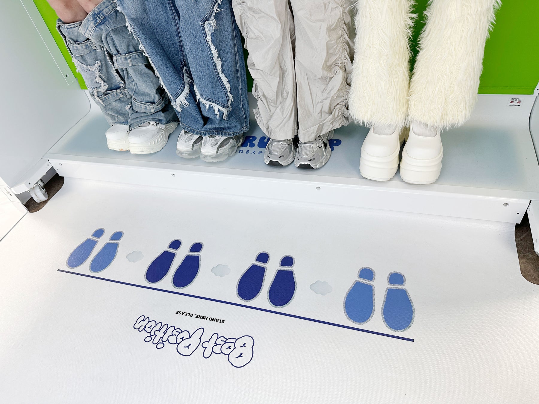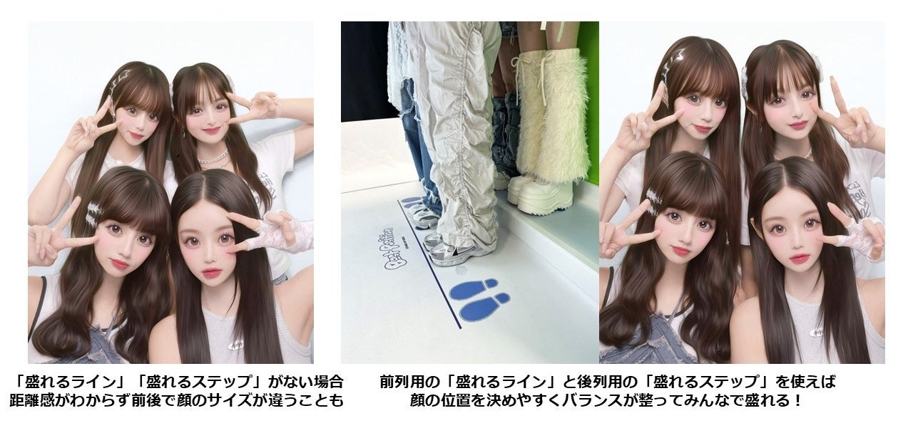 グループで撮影をする際には、隣の人との距離感や前後の顔の位置に迷いがちでしたが「盛れるライン」と「盛れるステップ」があれば、その心配も少なくなります。4人分の足跡マークで横に並びやすくなるのはもちろん、後ろに10cm程度のステップがあることで、前列は深くしゃがまずに、後列は顔の位置を決めやすくなり、より自然なポジションでの撮影が可能に。2人撮影のときにも後ろにステップ(段差)があるため、下がりすぎず盛れる位置にしっかり立つことができます。