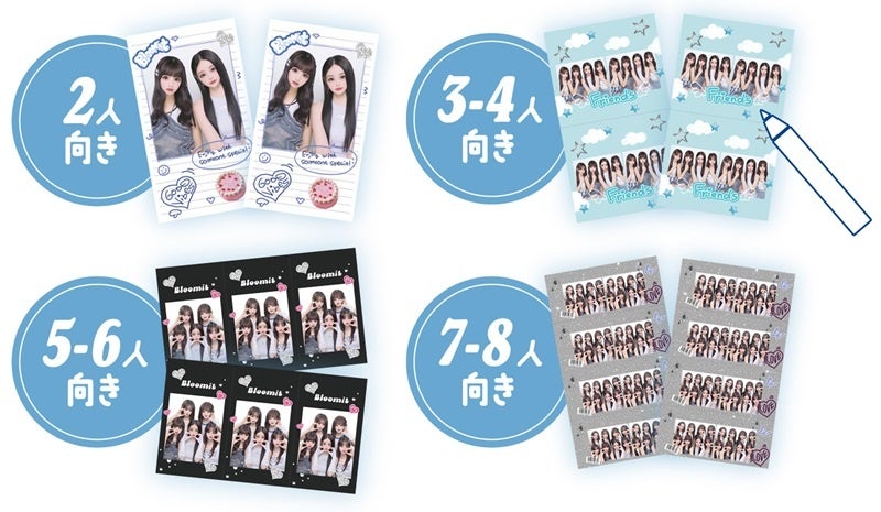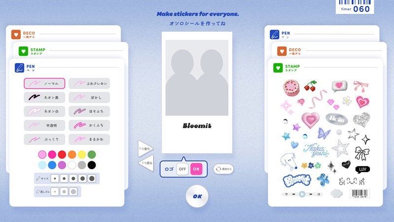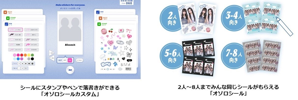 そして、シール自体に落書きをして唯一無二の個性をプラスできる「オソロシールカスタム」や、2人から最大8人まで同じデザインのシールがもらえる「オソロシール」も待望の新機能です。『Bloomit』は撮影からシール作成まで、プリの楽しさを最後までみんなで共有することができます。
