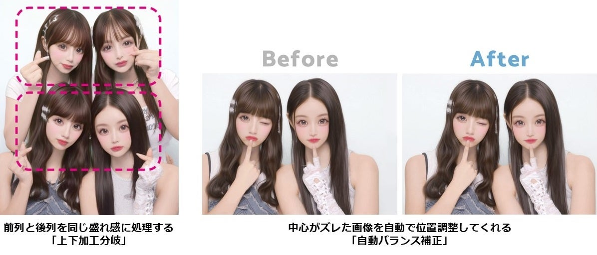 筐体内には、グループ全員にライティングが届くように天井と足元にワイドサイズのストロボを設置。さらに、前列と後列で別々の加工処理「上下加工分岐」を行うため、全員が“盛れる”環境を整えています。もし、撮影時に中心がズレてしまっても、自動で位置を調整してくれる「自動バランス補正」機能があるので安心です。『Bloomit』にはこうした“失敗しにくい仕掛け”がいくつも盛り込まれており、これから“プリ入学”をする人も安心して撮影を楽しむことができます。