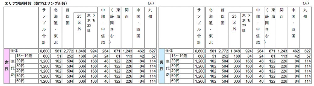 ※男女それぞれ、年齢5歳刻みで均等割付(エリアと年代による割付数詳細は下記数表を参照)