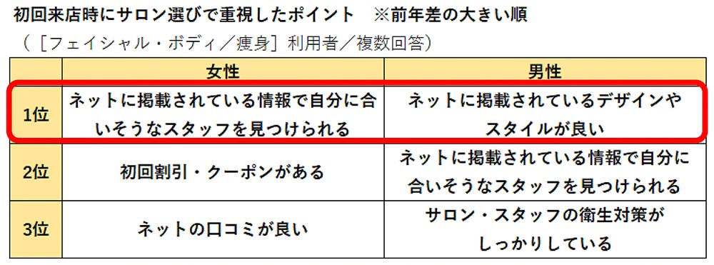 ポイント② エステサロン探しは、男女ともネット活用が前年から増加。女性は「スタッフ」、男性は「デザイン・スタイル」重視が増加