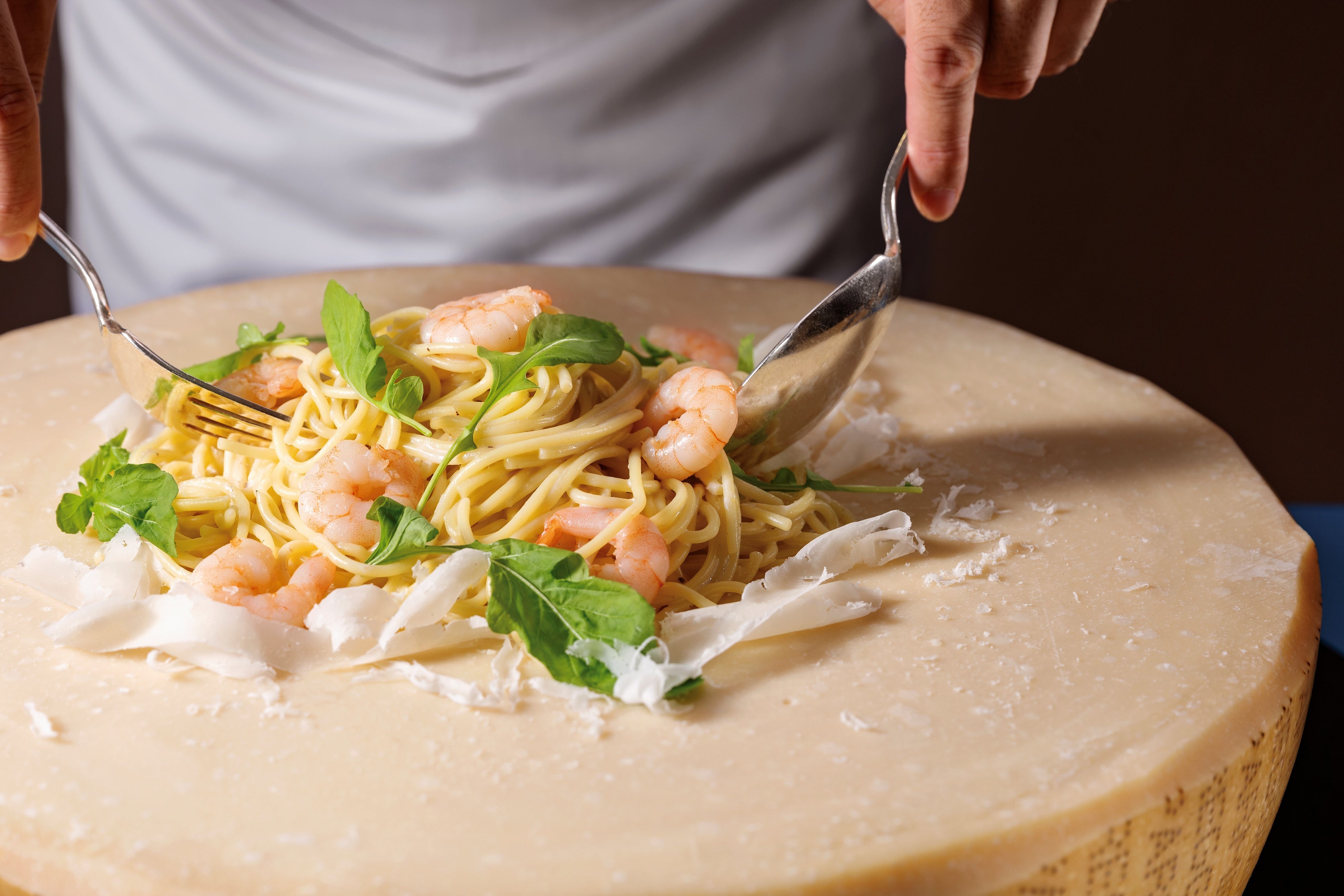 ・ホールチーズで仕上げるアンタルヤ風エビとルッコラのリングイネ
