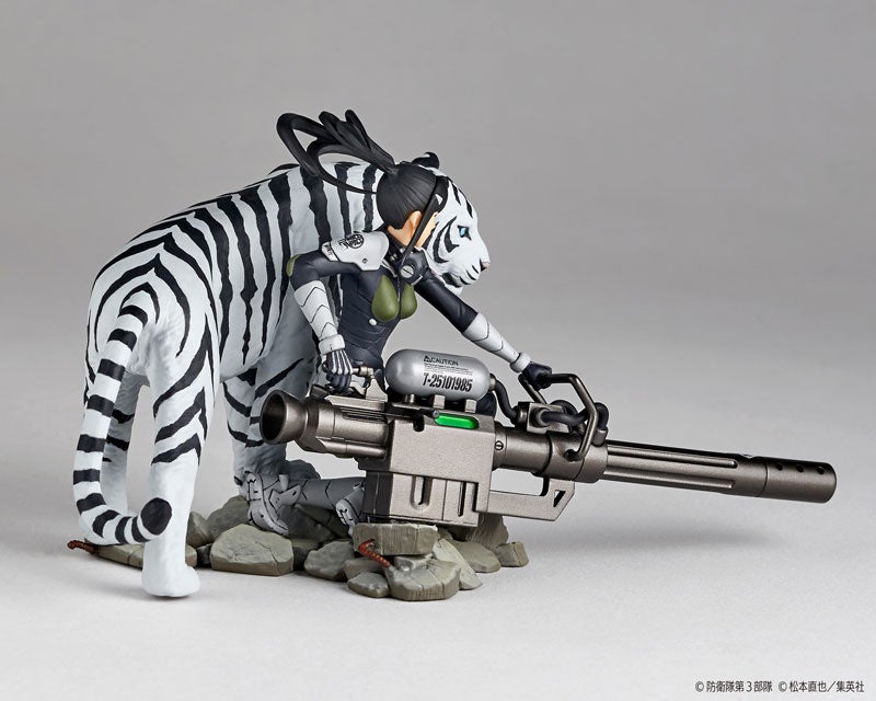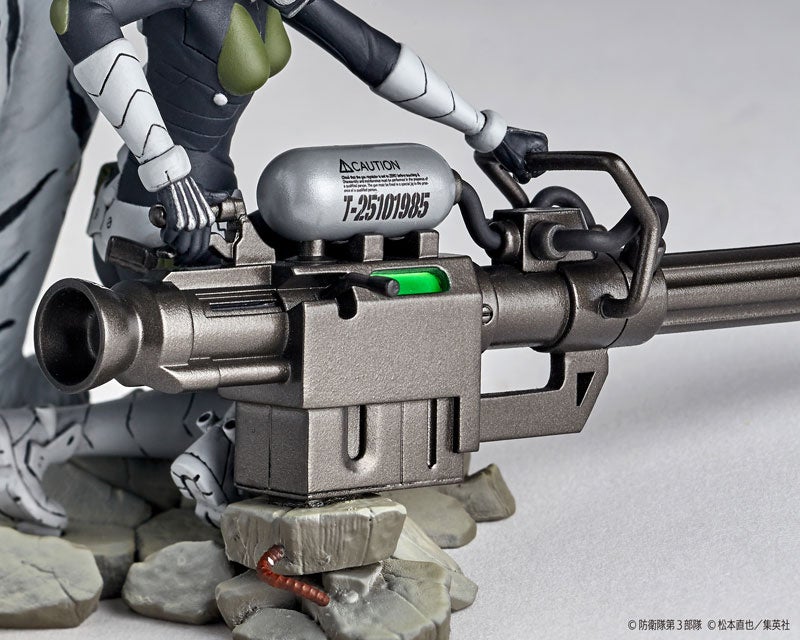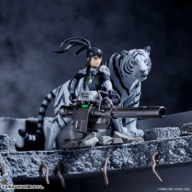 亜白ミナ専用武器の大型銃器を携えて冷静に怪獣を見据える姿をモチーフに、劇中描写の迫力を目指して武装を最大サイズにデフォルメしました。傍らには彼女の相棒でもある「伐虎」も寄り添わせ、静的なポーズながら彼女の持つ圧倒的な戦闘力が伝わる、存在感のある仕上りに!戦闘用のスーツや本獣の核をぶち抜く威力を持つ武装、足元のガレキまで、精密に作り込んだディテールも、強大な怪獣と対峙する緊迫感を盛り上げます。