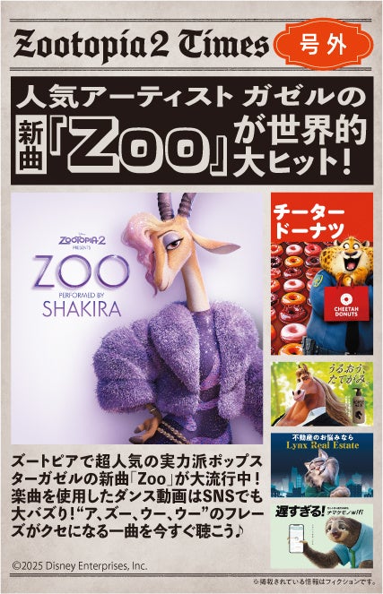 『ズートピア2』は、全世界興行収入洋画アニメーション&ディズニー&ピクサー・アニメーション史上歴代NO.1、洋画映画の週末興行収入ランキングとして史上最長の10週連続NO.1など、映画史に残る記録的大ヒットとなっており、南米の歌姫シャキーラが歌う劇中歌「Zoo」もディズニー楽曲国内のストリーミング再生史上最速3,800万回(2/12時点、劇場公開日より)を突破。日本の音楽チャートを席巻するなど、音楽も大ヒットを記録しています。