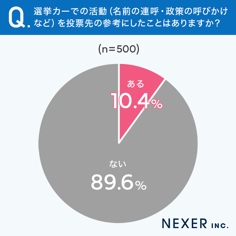 選挙カーの活動を投票先の参考にした経験は「ある」がわずか10.4%に留まりました。
