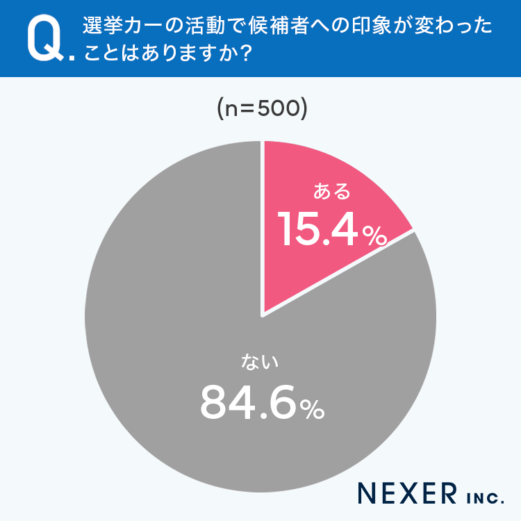 選挙カーの活動で候補者への印象が「変わったことはある」と答えたのは15.4%でした。
