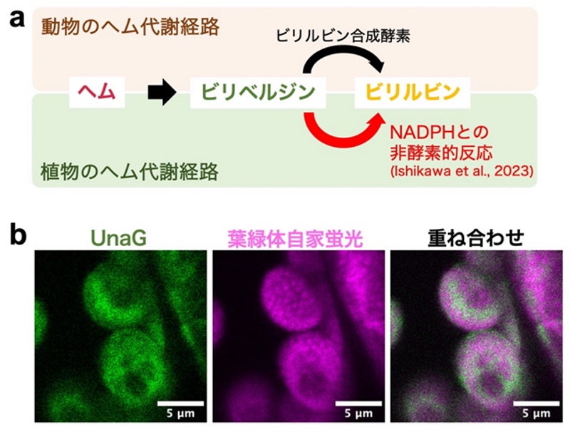 図1 a 動物と植物の間で異なるヘムからビリルビンが生じる代謝経路。 b 葉緑体の中でも、特にビリルビンのUnaG蛍光シグナルが強かったストロマの顕微鏡写真。自家蛍光(中央)で見える顆粒状の構造体がチラコイドであり、UnaG蛍光(左)は、それとは重ならないストロマで強く見える(右)。