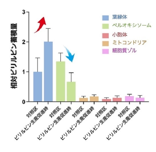 図2 葉緑体のビリルビンレベルの増加に伴う他の細胞小器官への影響。葉緑体のビリルビンレベルの上昇に伴い(赤矢印)ペルオキシソームのビリルビンレベルは減少したが(青矢印)、他の細胞小器官では変化が見られなかった。