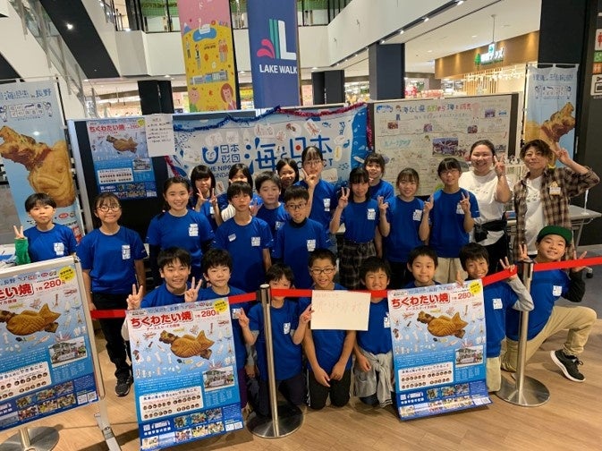 商品パッケージやポスターには児童が描いたイカのイラストがデザインに採用され、発売を記念した販売イベントは、子供たちが運営して実施。限定100個で販売されたちくわたい焼(1個280円)はわずか20分で完売するほどの盛況ぶりでした。