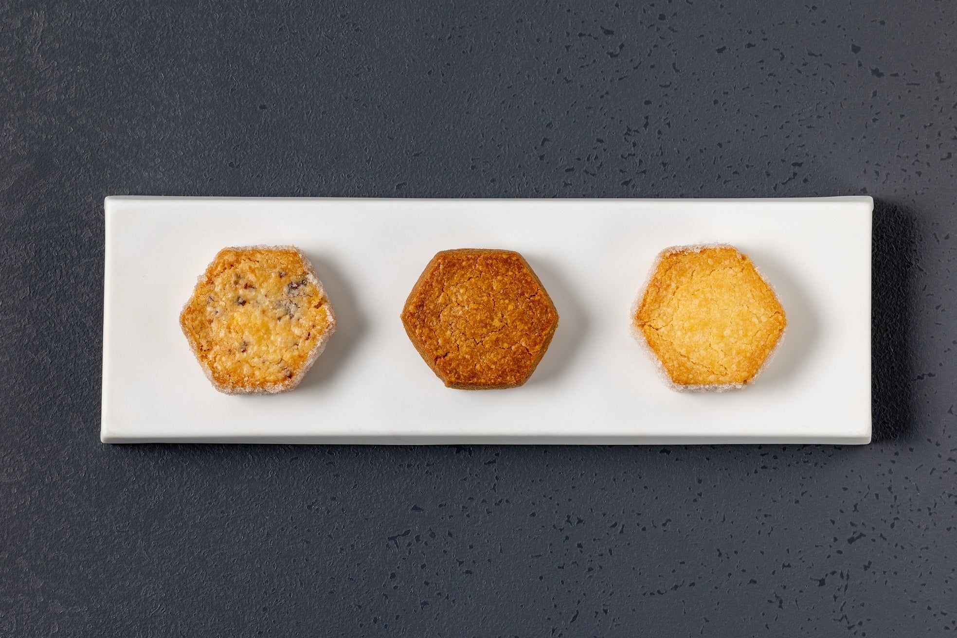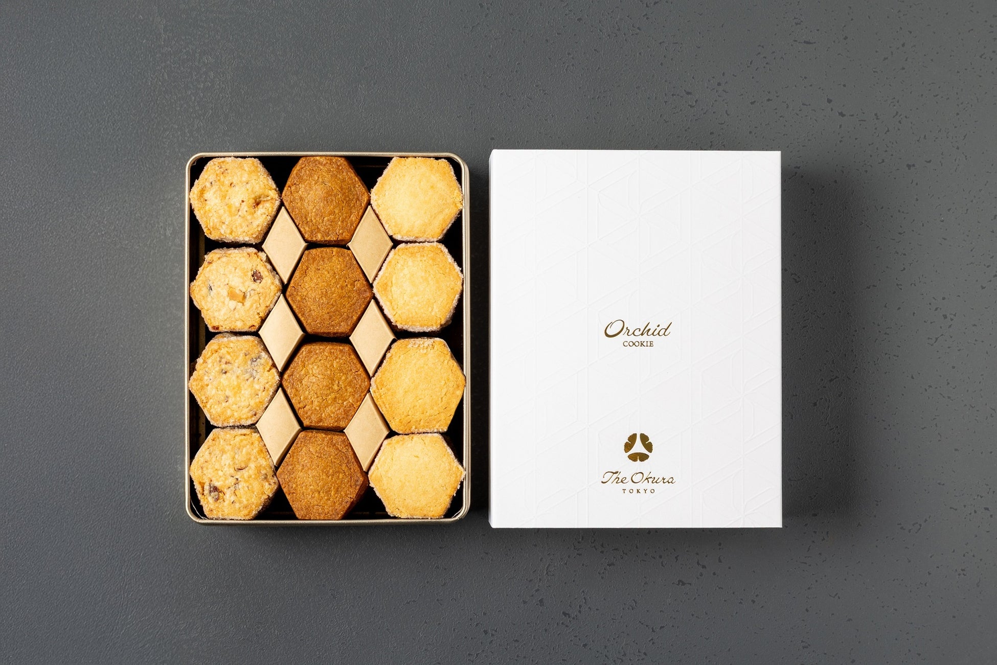 シンプルで奥深い味わいの3種のサブレを、ホテルメイドの逸品として丁寧に焼き上げました。口に入れた瞬間にほろっとくずれる食感と、そこからふわりと広がる香りの余韻を最大限引き出すために、素材の組み合わせや配合にこだわりました。また、館内各所の意匠にも用いられている六角形(亀甲文様)をかたどり、オークラ東京の美意識を具現化する、新たなシグネチャー商品となる一品です。