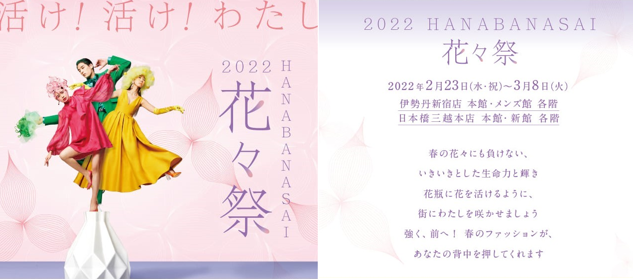2022年花々祭のテーマは、「活け!活け! わたし」。三越伊勢丹各店舗で、ここからはじまる“新しい春“のファッションにふさわしい、婦人・紳士衣料品雑貨やリビングアイテム、旬な食材をご紹介いたします。