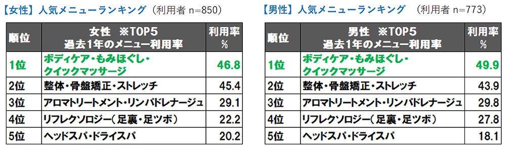 人気メニューランキング発表!1位は男女とも「ボディケア・もみほぐし・クイックマッサージ」