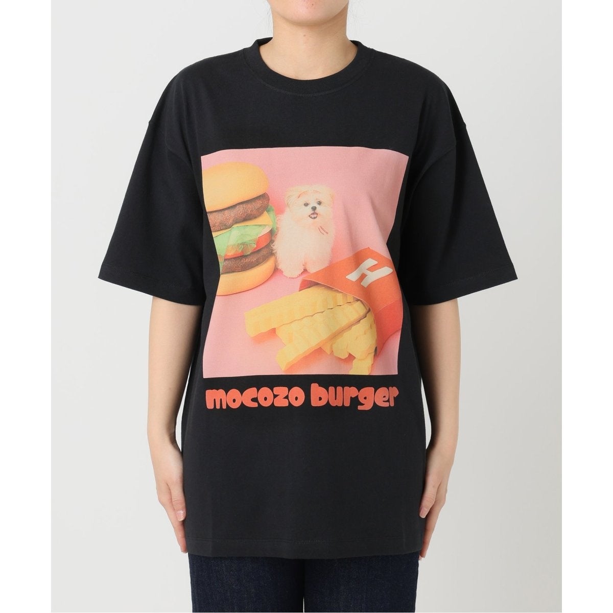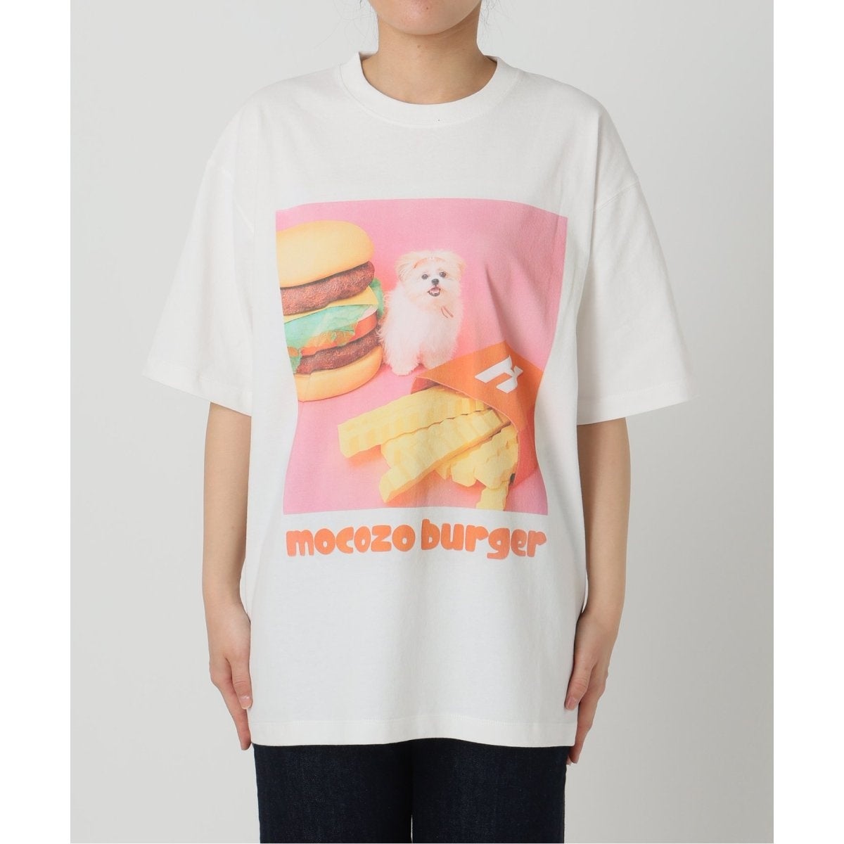 東京・目黒にあるドッグフォトスタジオ「ハーハフー」の「ハンバーガー&フライドポテトのセット」で撮影した写真がプリントされたフォトTシャツ。バーガーショップ店員のようなサンバイザーを被っているモコゾウがキュートで、巨大なフードに挟まれミニチュアになったような世界観が愛らしい一着。ユニセックスで着られるフリーサイズ、2色展開。