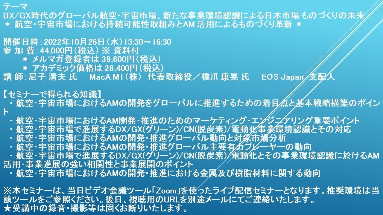 先端技術情報や市場情報を提供している(株)シーエムシー・リサーチ(千代田区神田錦町: https://cmcre.com/ )では、 各種材料・化学品などの市場動向・技術動向のセミナーや書籍発行を行っておりますが、 このたび「DX/GX時代のグローバル航空・宇宙市場、新たな事業環境認識による日本市場 ものづくりの未来」と題するセミナーを、 講師に尼子 清夫 氏 MacA M1(株) 代表取締役 橋爪 康晃 氏 EOS Japan 支配人)をお迎えし、2022年10月26日(水)13:30より、 ZOOMを利用したライブ配信で開催いたします。 受講料は、 一般:44,000円(税込)、 弊社メルマガ会員:39,600円(税込)、 アカデミック価格は26,400円(税込)となっております(資料付)。