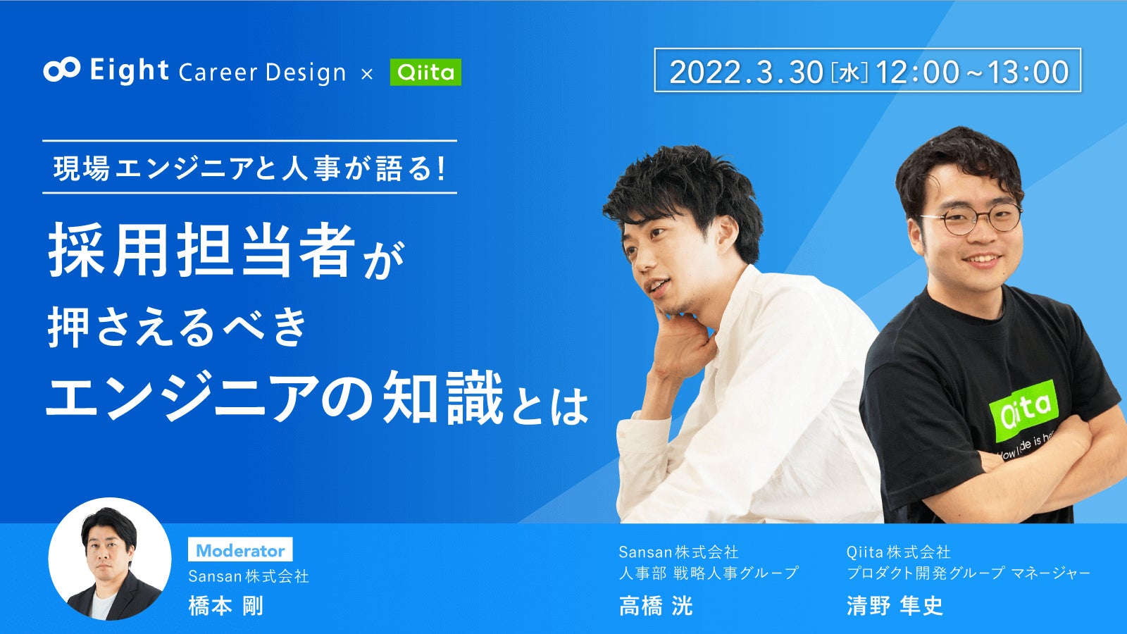 そこで今回は、モデレーターとしてSansan株式会社の橋本剛氏、エンジニア採用担当経験者としてSansan株式会社の高橋洸氏、Qiita株式会社のエンジニアである清野隼史の3名で現場エンジニアとエンジニア採用担当経験者目線でエンジニア採用担当者に持っていてほしいスキルや知識をテーマにセミナーを開催いたします。