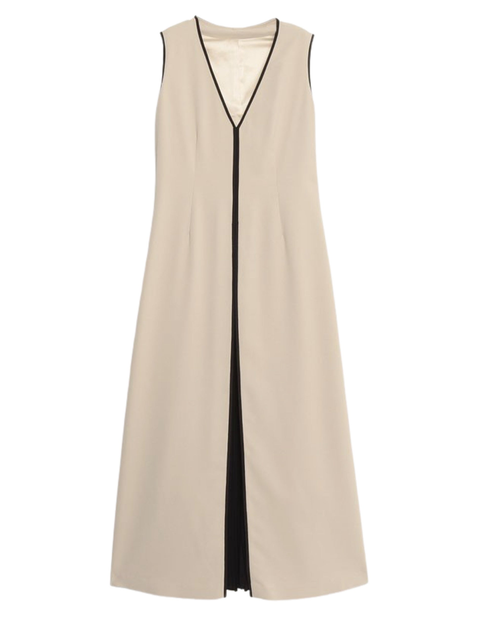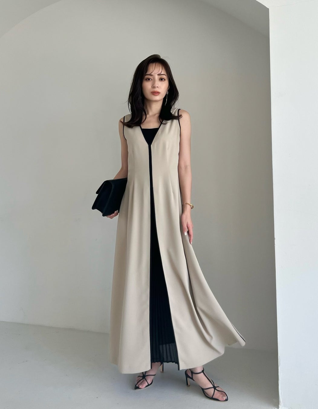 手の込んだバイカラーの共地パイピングが目を惹くデザインのワンピース。