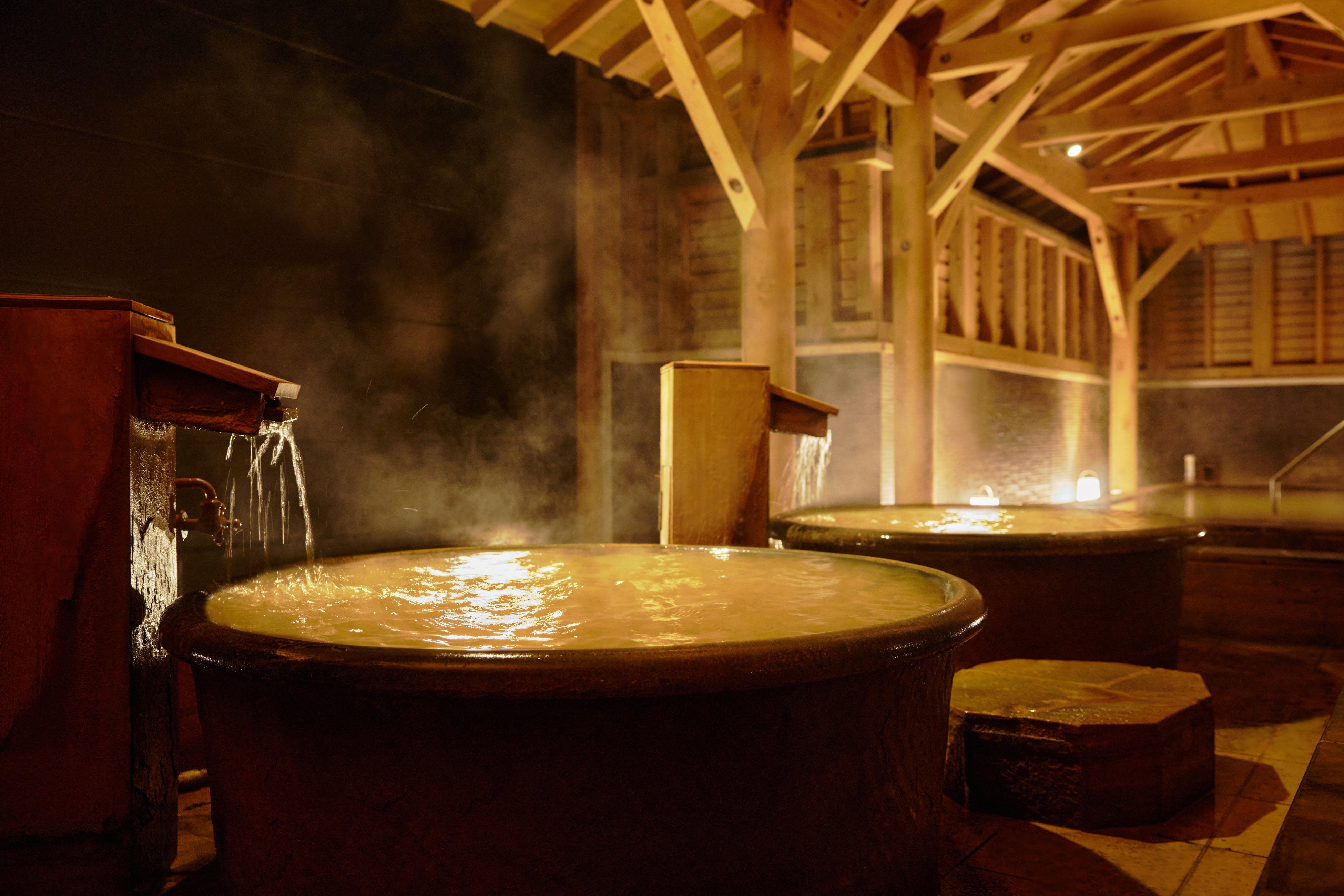 「琥珀色の湯」では、鉄分・塩分を多く含む源泉かけ流しの温泉に加え、しっかりと発汗できるドライサウナと、優しい蒸気で包み込むミストサウナの二種を完備。約15℃の水風呂やよく温まる温泉入浴とあわせることにより、最高の「ととのう」体験を約束します。