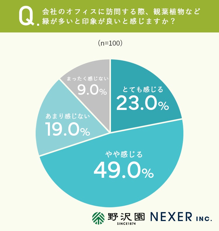 そこで今回は株式会社野沢園と共同で、事前調査で「営業や面接など様々な理由で会社のオフィスに訪問する機会がある」と回答した全国の男女100名を対象に「オフィスの観葉植物」についてのアンケートをおこないました。