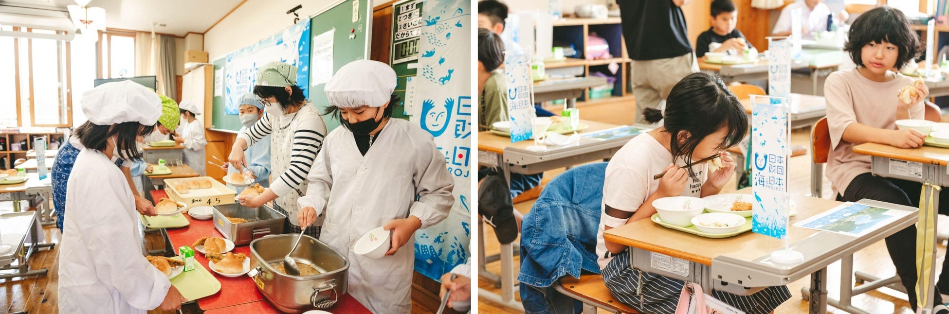 佐伯市立直川小学校、直川中学校、宇目緑豊小学校、宇目緑豊中学校では「アイゴのフライ」が提供されました。丸パンと一緒に提供されたためフィッシュバーガーのようにアイゴのフライを一緒に挟んで食べる生徒もいました。佐伯市立東雲小学校、東雲中学校では「アイゴのカレーマリネ」が学校給食で提供されました。給食では、オリジナルのランチョンマットも配布され食べながらも学べる工夫をしました。