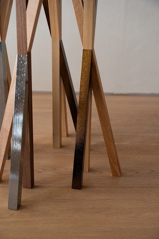 「直線状の木の枝、『木組み』のユニットで作ったジュエリー・デスク。ブロンズとシルバーのメタル塗装が、手作業で仕上げられた樹種ごとの木の美しさを引き立て、世界で同じものが二つとないピースとなっています。」 – 隈研吾