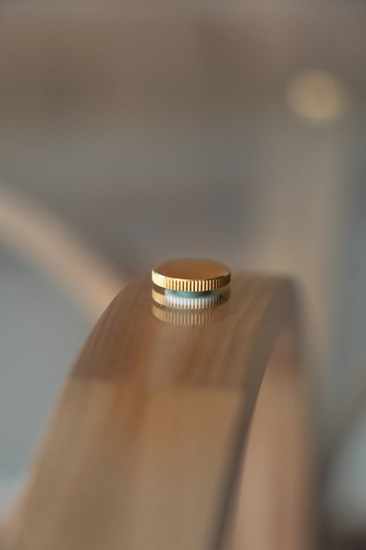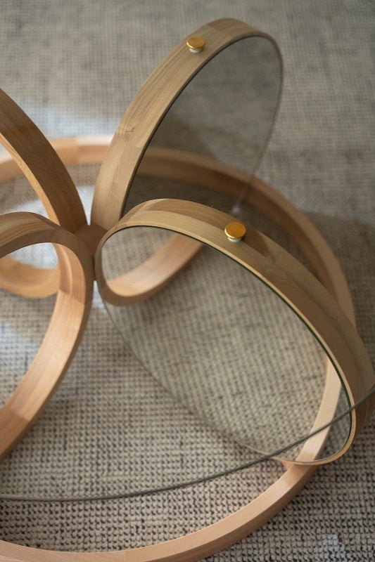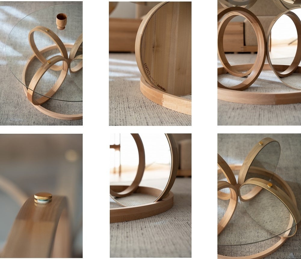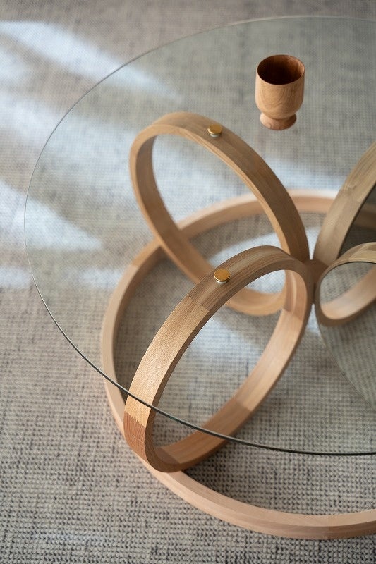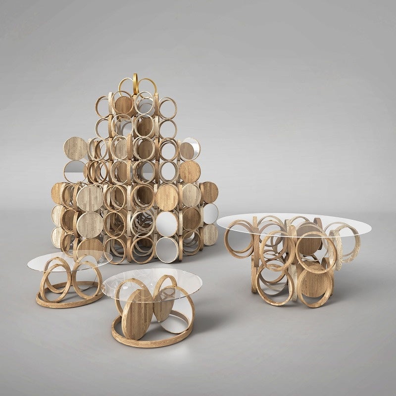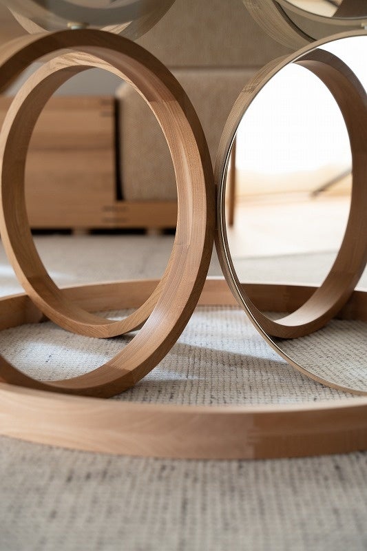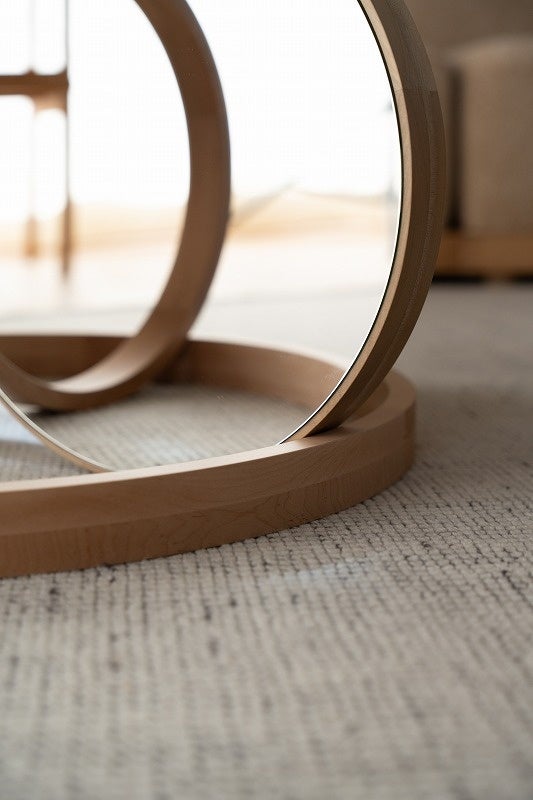 「木のリングとディスクを組み合わせて作った、柔らかく有機的なテーブル。円形の鏡がきらきらと光を集め、明るく軽やかな木の表情を引き立てます。」