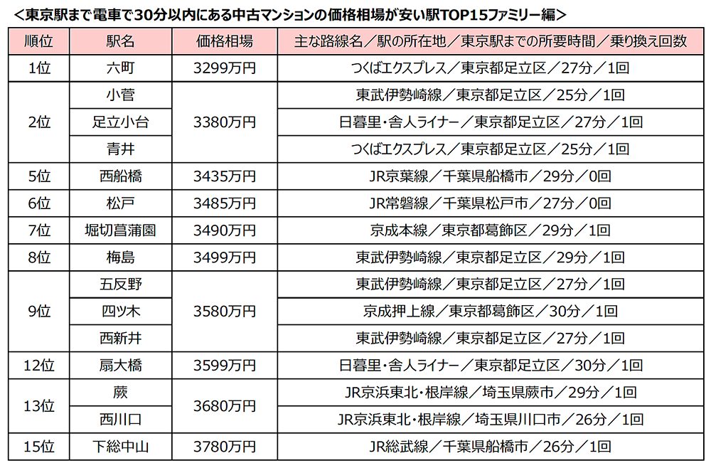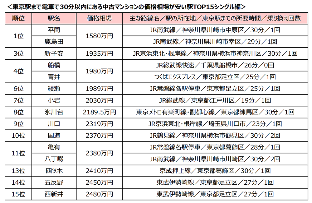 「東京駅」まで30分以内、中古マンション価格相場が安い駅ランキング 「シングル向け」1位は平間駅と鹿島田駅!「カップル・ファミリー向け」は足立区の駅が8駅ランクイン