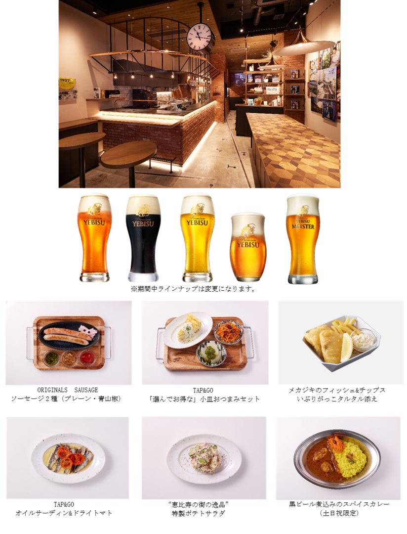 本店舗では高品質の「ヱビスビール」をはじめ「琥珀ヱビス プレミアムアンバー」ほか数種のヱビスブランド商品をご用意しています。季節限定のラインナップや、5種類のヱビスから組み合わせを選ぶ、ビアブレンドなど、ヱビスならではの本格的なおいしさと、豊富なラインナップがあるからこその、多彩なビールの楽しみ方を体験できることができます。フードメニューは“TAP&GO”をコンセプトに、お好みに合わせてセレクトできる駅ナカならではの短時間でお楽しみいただける小皿料理をはじめ、彩り豊かな3種の特製ディップソースで味わうオリジナル和香ソーセージや、ヱビスビールの奥深い味わい引き出すフリット、煮込み料理などをご用意します。また、恵比寿の街の飲食店と定期的にコラボレーションを行い“恵比寿の街の逸品”として「特製ポテトサラダ」をラインナップします。多様なヱビスと、料理のマリアージュをお楽しみください。