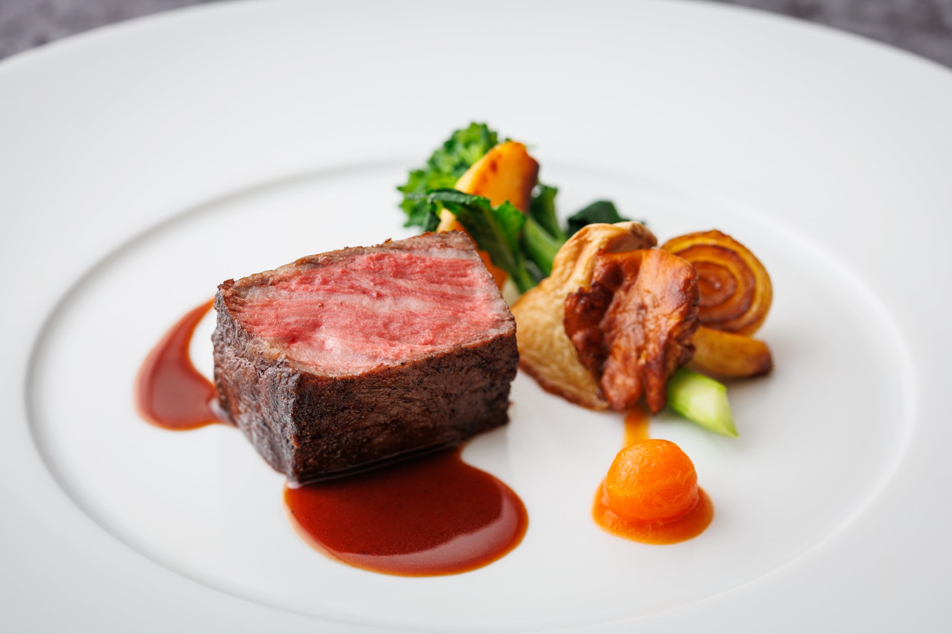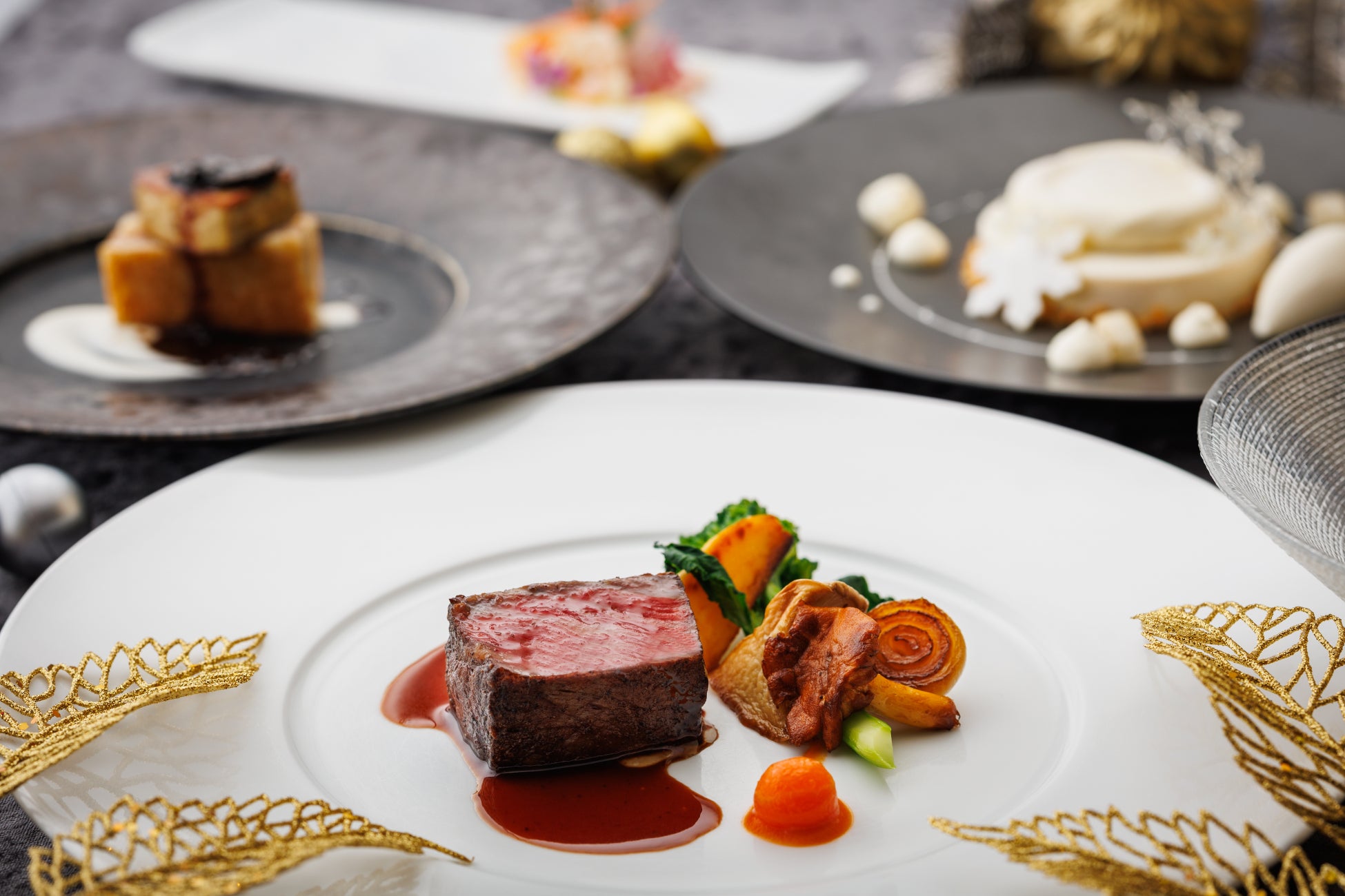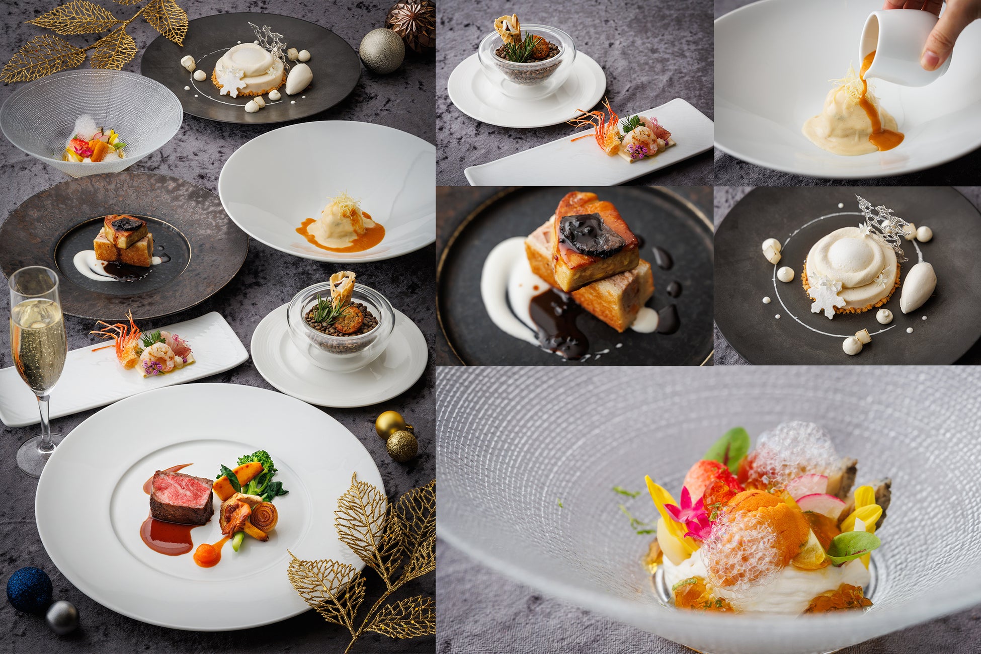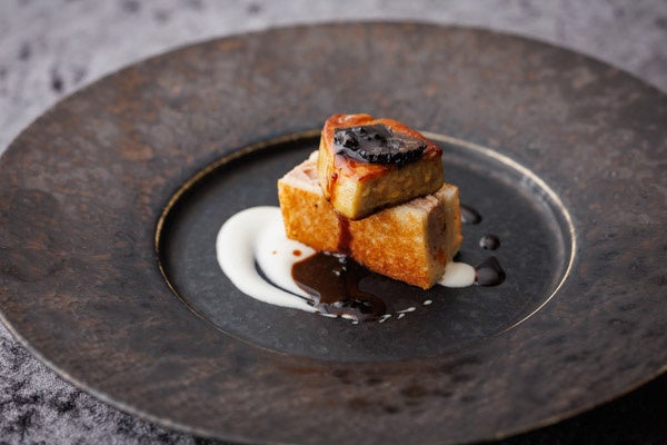 九絵とキャビアの始まりの一皿に続き、鮑、蟹、生雲丹の彩り豊かな冷前菜、フォワグラ、トリュフなどの豪華食材を使用した前菜へと続きます。メインディッシュはお好みに合わせて黒毛和牛サーロインステーキ、または土佐鴨のローストよりお選びいただけます。締めくくりには洋梨とキャラメルソースを芳醇なブルボンバニラのムースが包み込む、特別なデザートを提供いたします。