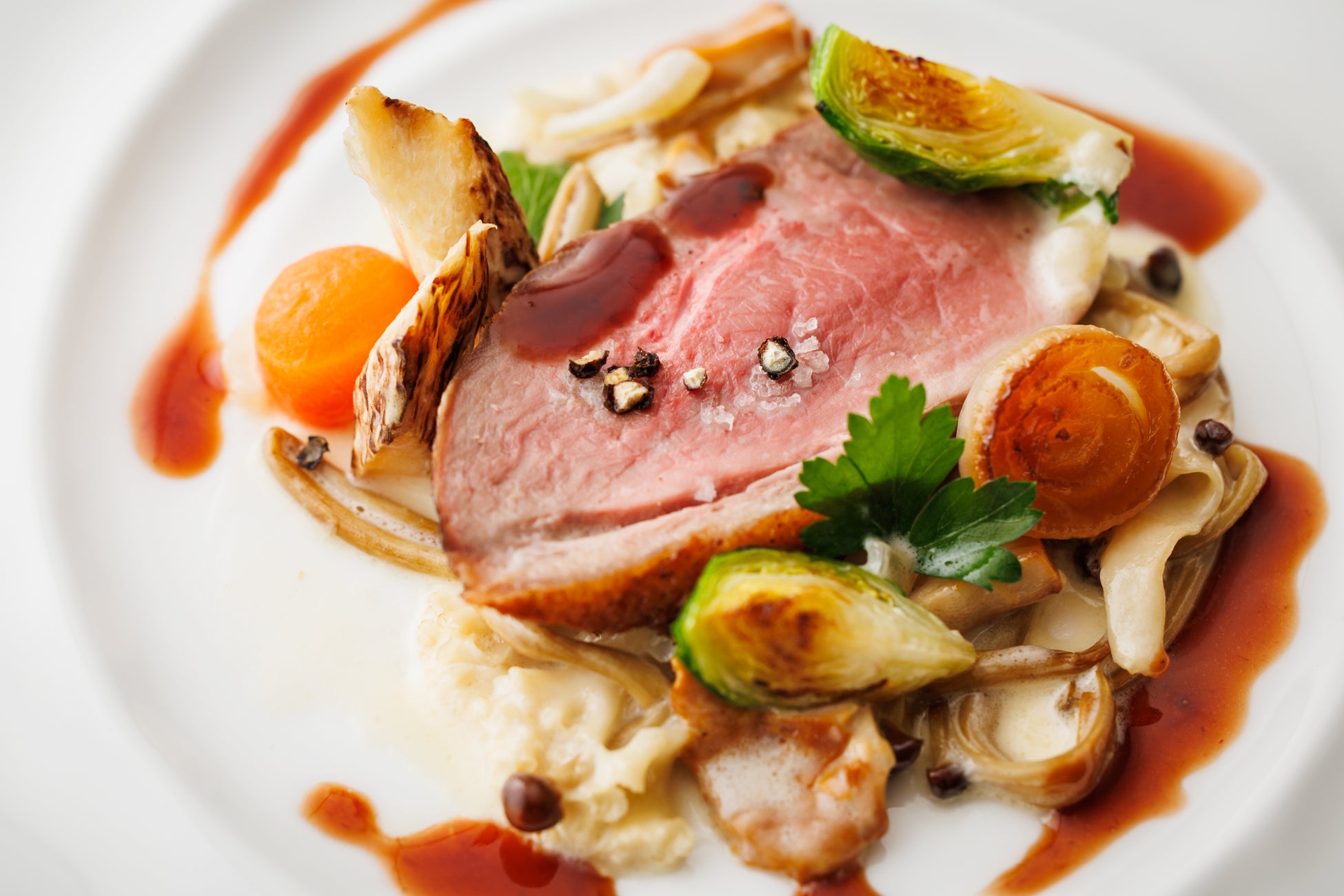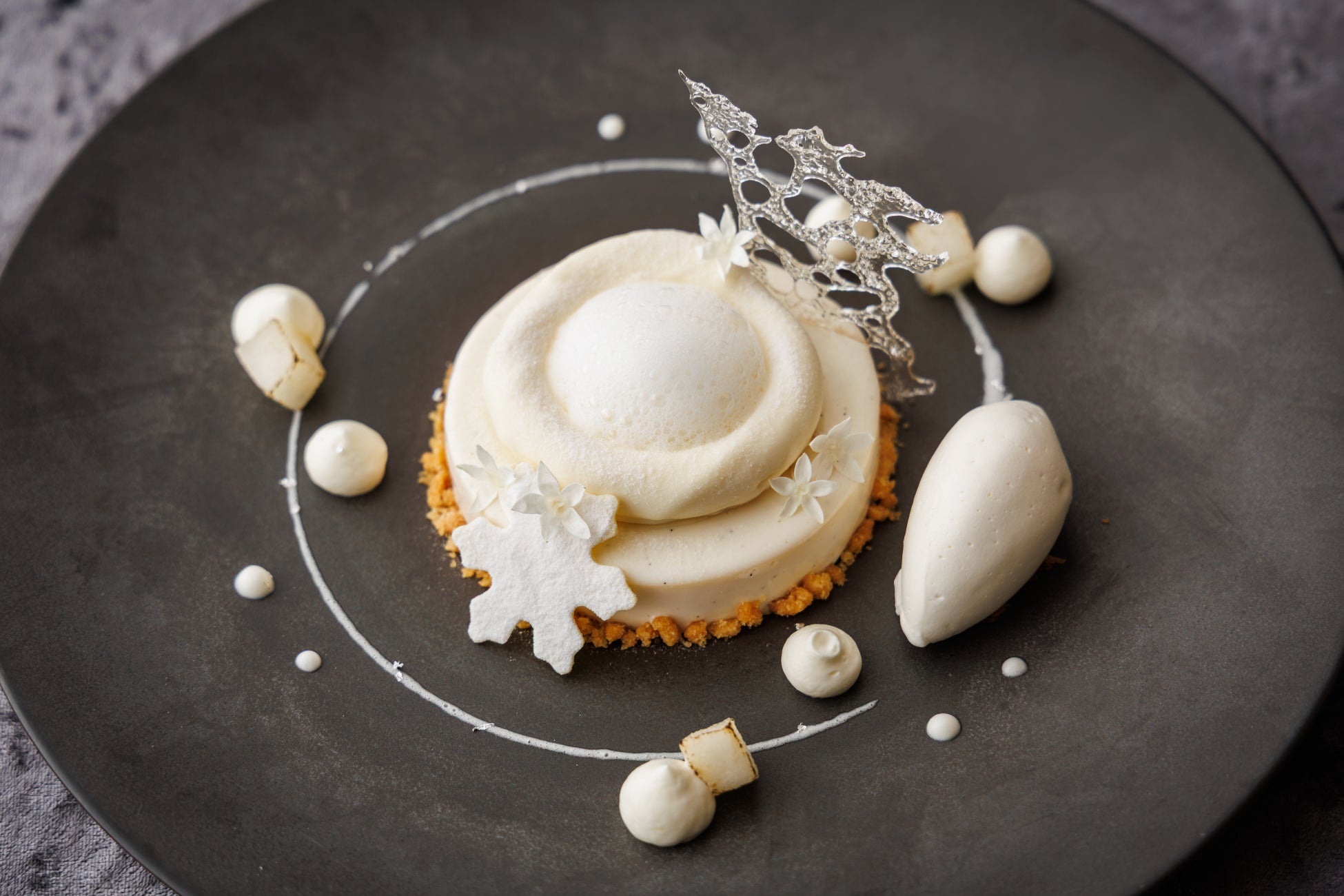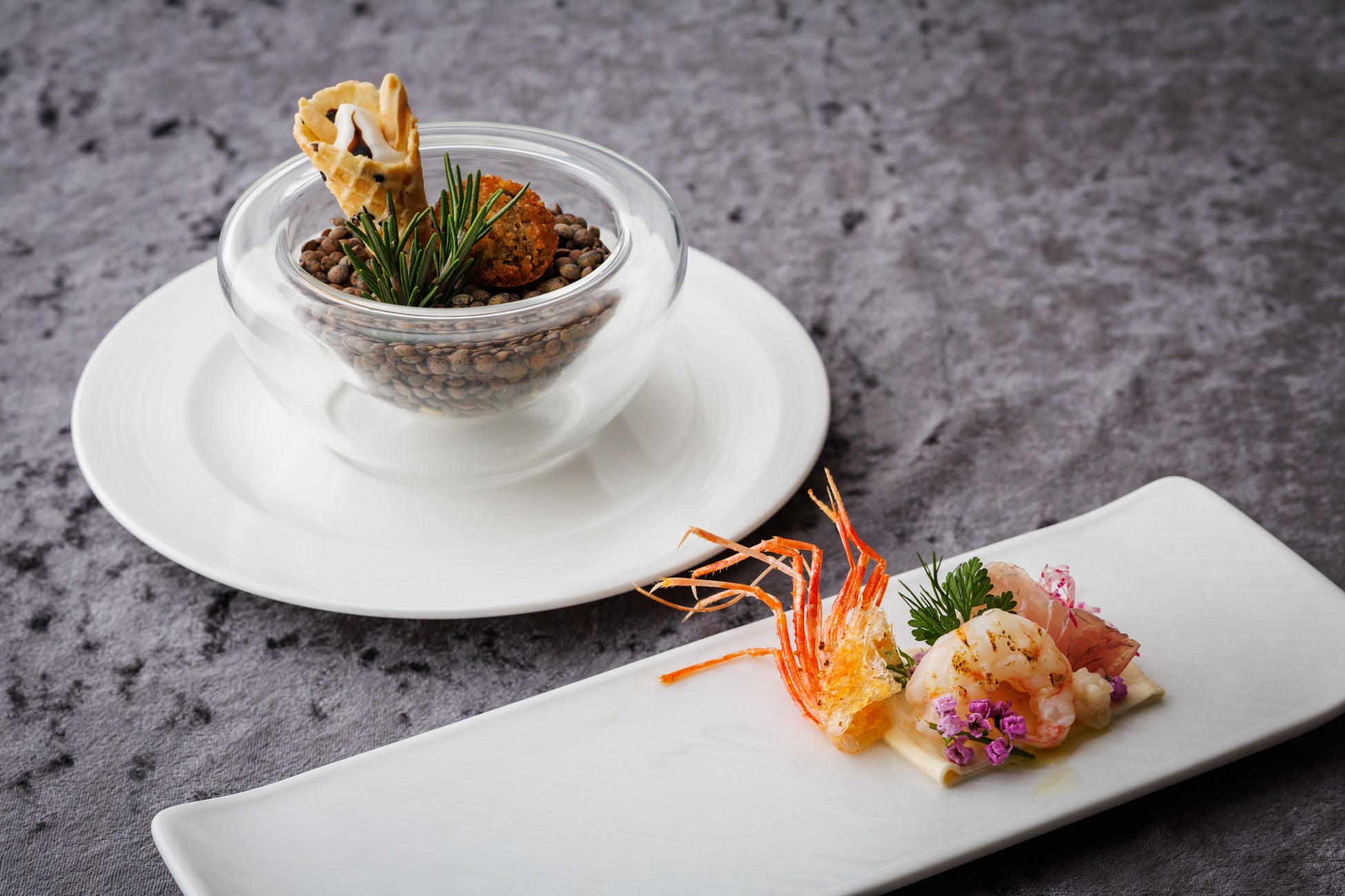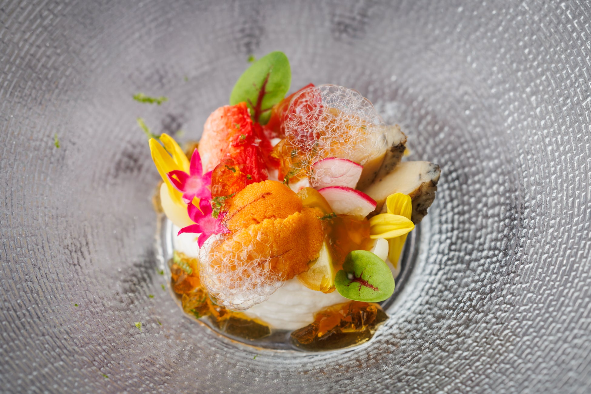九絵とキャビアの始まりの一皿に続き、鮑、蟹、生雲丹の彩り豊かな冷前菜、フォワグラ、トリュフなどの豪華食材を使用した前菜へと続きます。メインディッシュはお好みに合わせて黒毛和牛サーロインステーキ、または土佐鴨のローストよりお選びいただけます。締めくくりには洋梨とキャラメルソースを芳醇なブルボンバニラのムースが包み込む、特別なデザートを提供いたします。