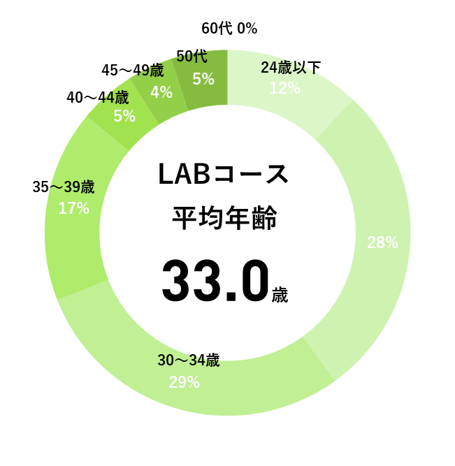 コース別での平均年齢は大きく変わりなく、どちらのコースも20代前半から50代後半、60代まで幅広い年齢層の方がいます。