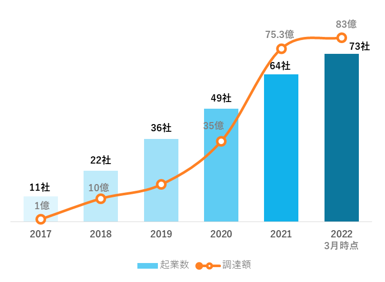 最初の卒業生輩出(2016年9月)から6年半が経ち、2022年3月時点で73社が起業、資金調達総額はついに83億円超となりました。
