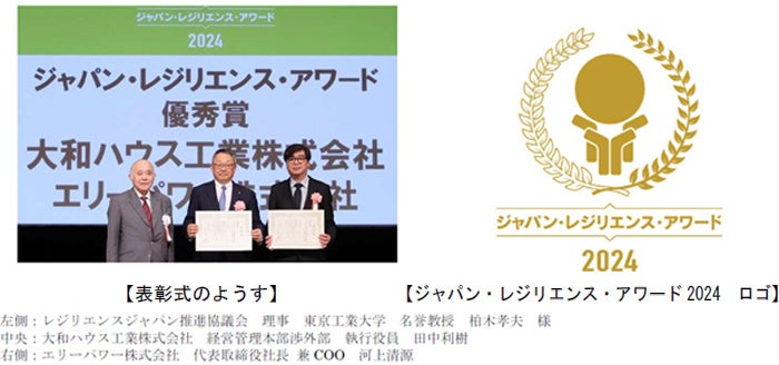 その成果である戸建住宅団地「セキュレア豊田柿本」や再生可能エネルギー100%の街づくりのひとつである「セキュレア船橋グランオアシス」での実績に基づき、大和ハウス工業では、防災配慮住宅「災害に備える家」に、エリーパワーでは、蓄電システムAI自動制御サービス「ELIIY CLOUD AI-SORA (エリークラウド・エーアイ・ソラ)」などにつなげたことが評価され、優秀賞を受賞しました。