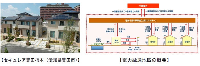 戸建住宅26戸を5つのグループに分け、大和ハウス工業が供給する再生可能エネルギー価値を付加した電力を、株式会社ファミリーネット・ジャパンの一括受電の仕組みを活用し、各住宅に配電します。また、「セキュレア豊田柿本」のデータ分析から制御機能を追加し、太陽光発電や電力利用実績、気象情報などに基づいたAIによる予測をします。そして、蓄電池や給湯器などを最適に遠隔制御することで、太陽光発電の発電電力と蓄電池の放電電力がグループ内で効率よく消費され、再生可能エネルギーの活用を促進します。