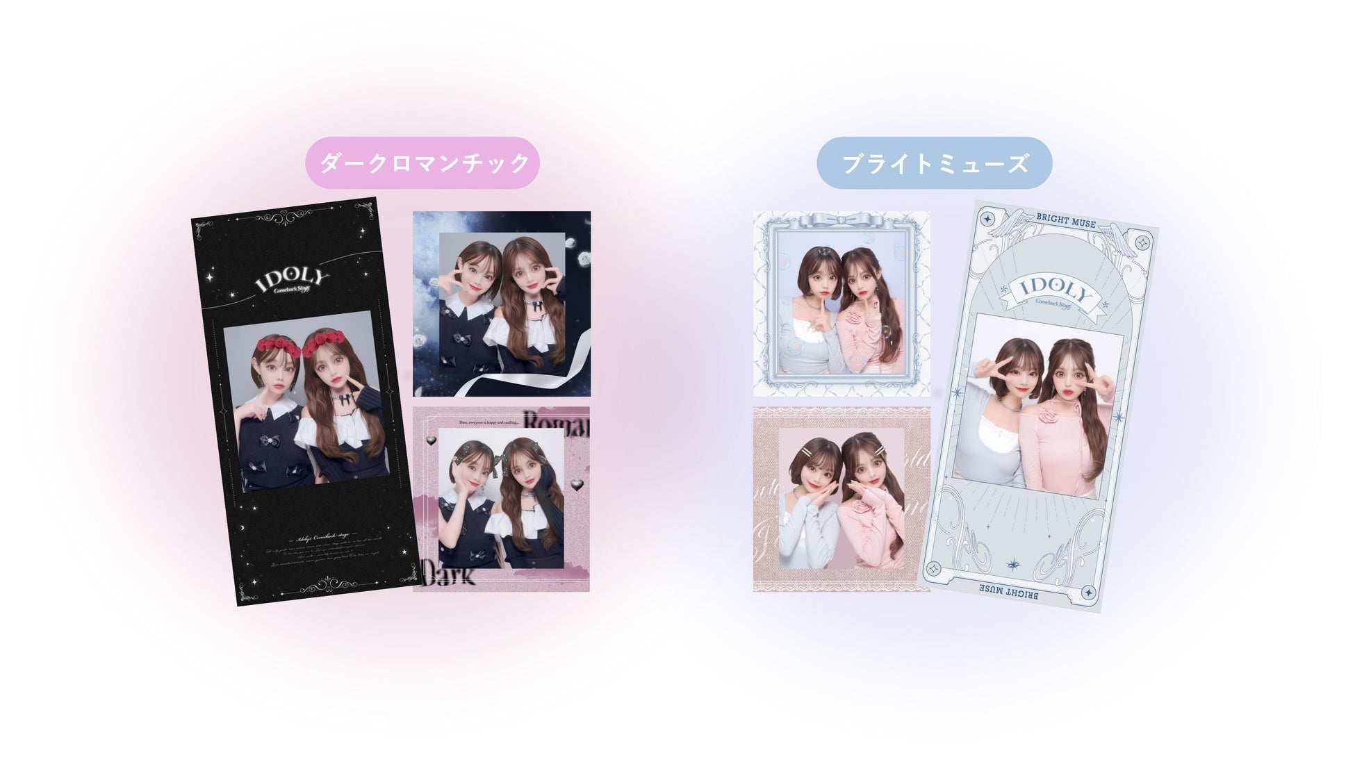 今回『IDOLY Comeback Stage』に登場するコンセプトは、前作の世界観や写りを継続して搭載する「ブライトミューズ」と、黒を基調にした新しい世界観「ダークロマンチック」の2つ。選択したコンセプトに合わせて写り・撮影クリエイト・BGM&画面デザイン・シールデザインなどのコンテンツ全体が変わる仕様にパワーアップしました。前作以上に没入感ある“韓国アイドル体験”に是非ご注目ください。