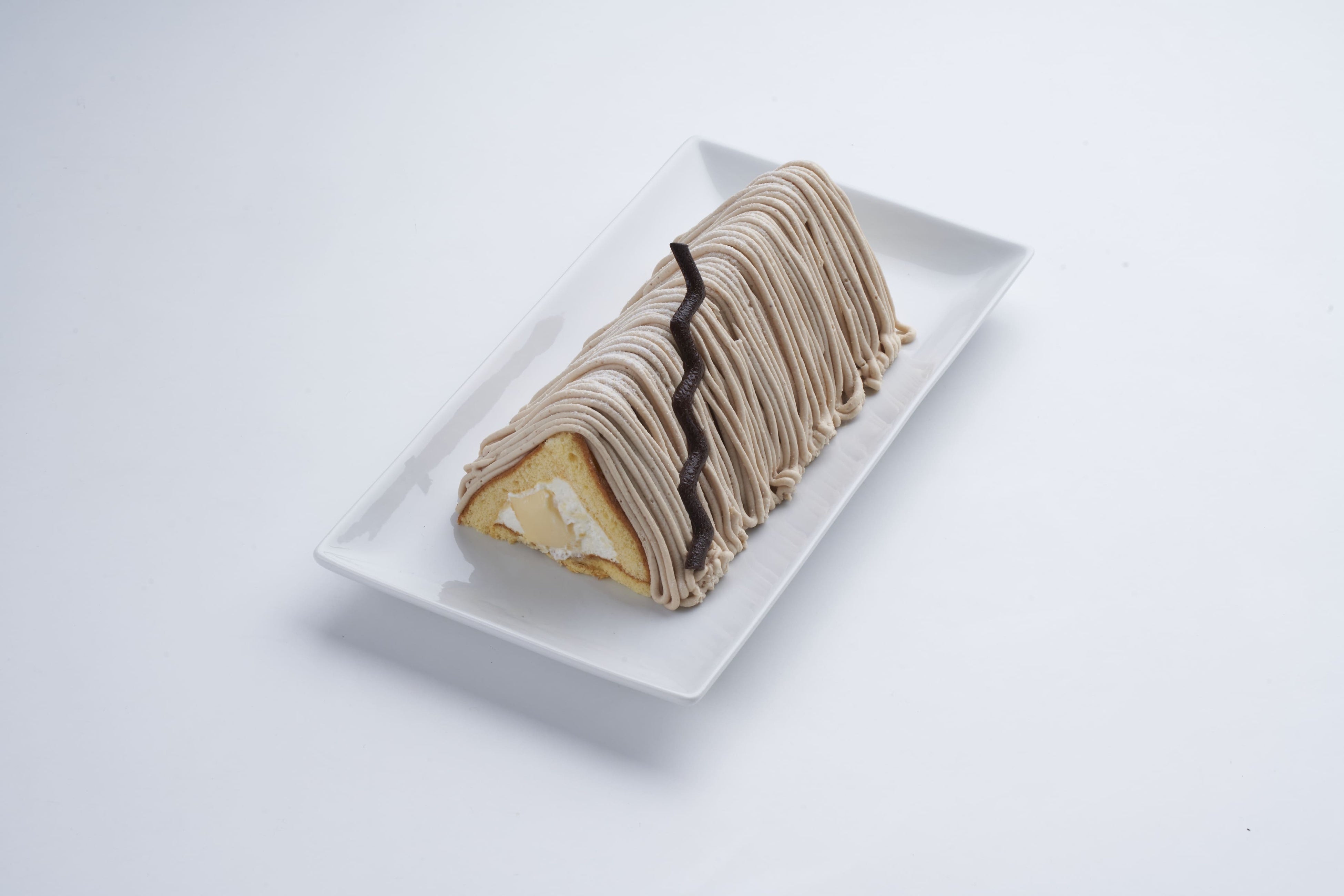 生クリームとプリンをたっぷりのマロンクリームで包んだロールケーキ「マロンプリンハイム」。家をイメージさせる、三角形のデザインも新鮮!たっぷりとマロンクリームを絞りました。