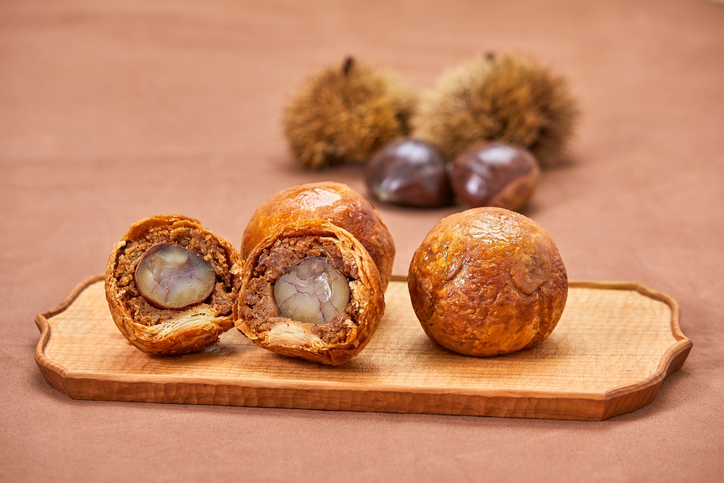 丹波栗を渋皮煮し、金時芋のペーストと合わせて焼き上げました。サクサクパイ生地の中にほっくりとした丹波栗のおいしさをお楽しみください。