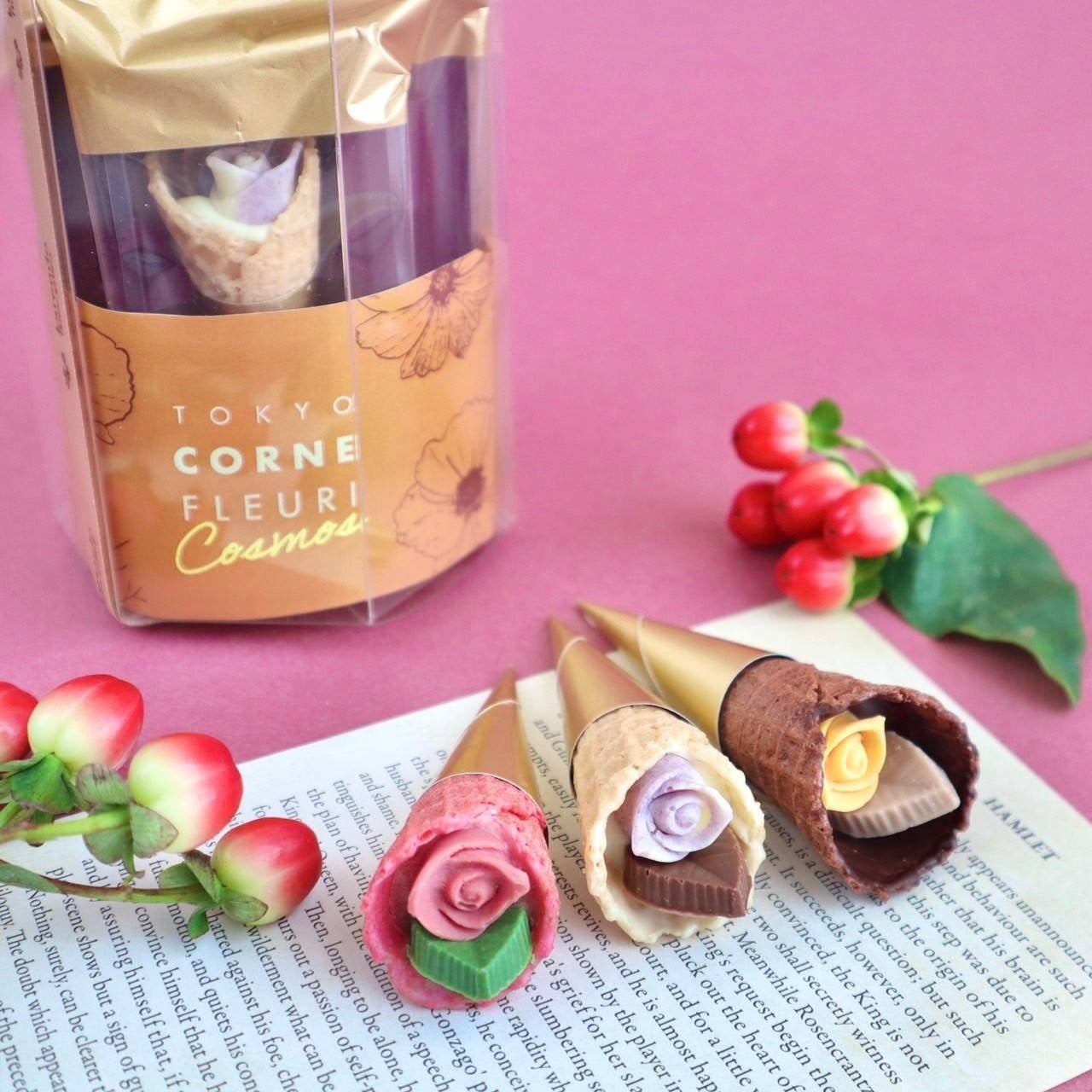 バラとリーフのチョコレートをコーンで包み込んだ花束のようなスイーツ!ギフトにもお土産にもぴったりな3個入りで、コスモスをイメージした色の期間限定芋フレーバー入りです。