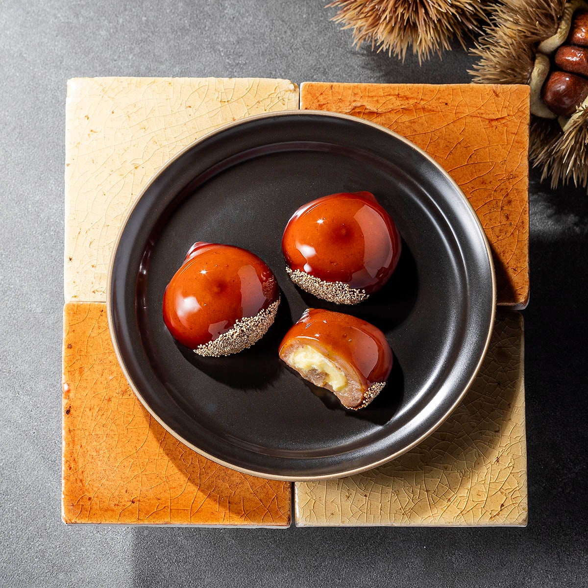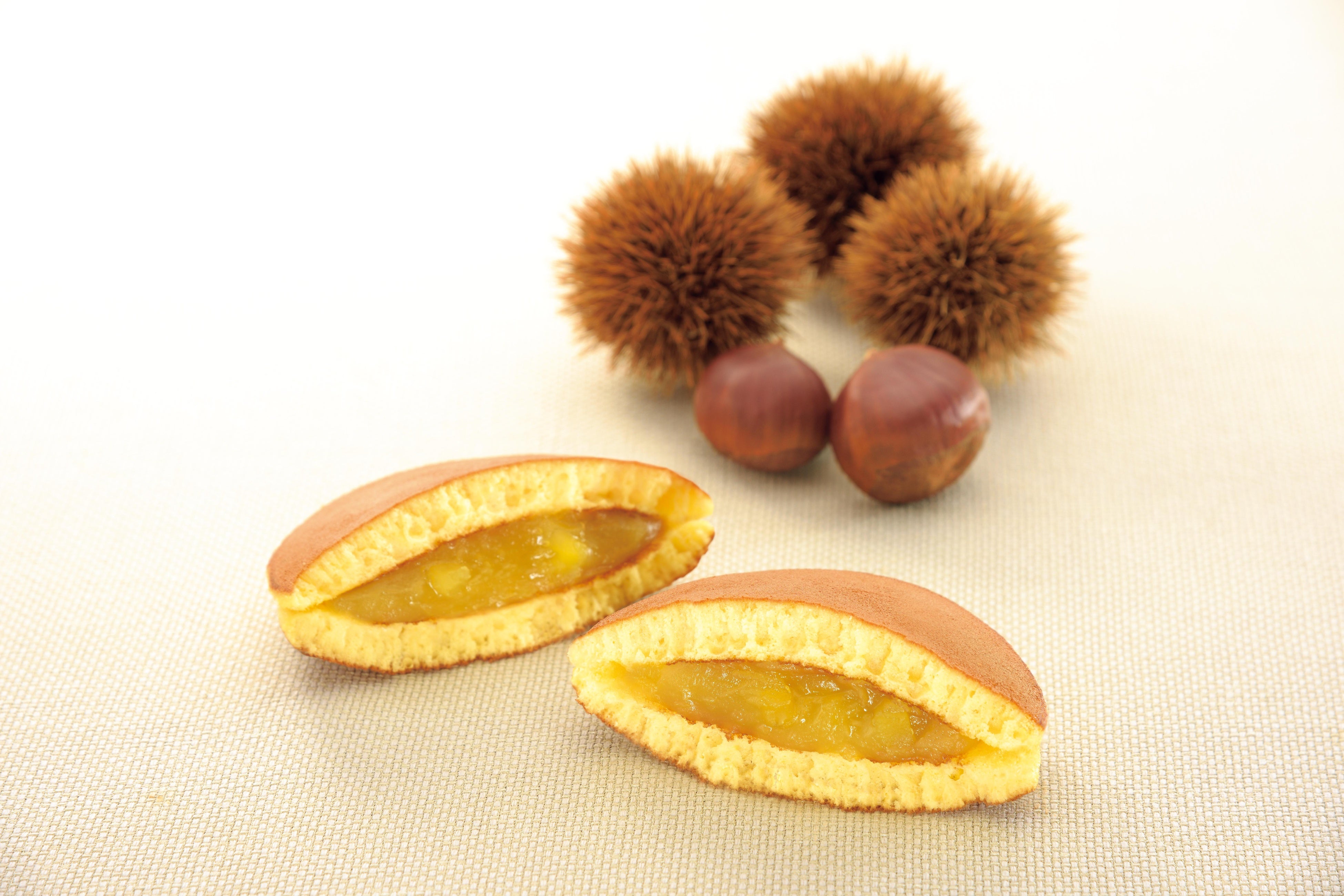 卵黄を増やし、和三盆糖を加えた生地と栗のペーストをあん全体に馴染ませ口の中に栗の風味が広がる、秋にしかお召し上がり出来ない期間限定の商品です。