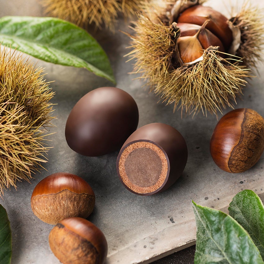 バニラ風味のマロンペーストを炊き合わせて香り高いこだわりのマロン餡をつくりました。しっとりと焼きあげたココア生地とマロンの香りのダークチョコ層が、より一層マロンの風味を引き立てます
