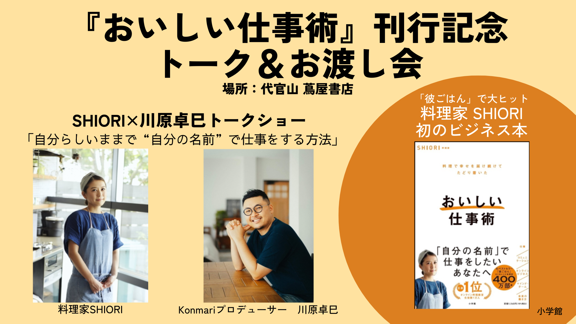 22歳で刊行したレシピ本『作ってあげたい彼ごはん』で大ヒット、現在までの著書累計は417万部を超える料理家SHIORI。彼女の「仕事術」を初公開したビジネス本『おいしい仕事術』(小学館)が3月17日発売! この刊行を記念し、3月25日(土)に代官山 蔦屋書店にて、トーク&サイン本お渡し会を開催します。