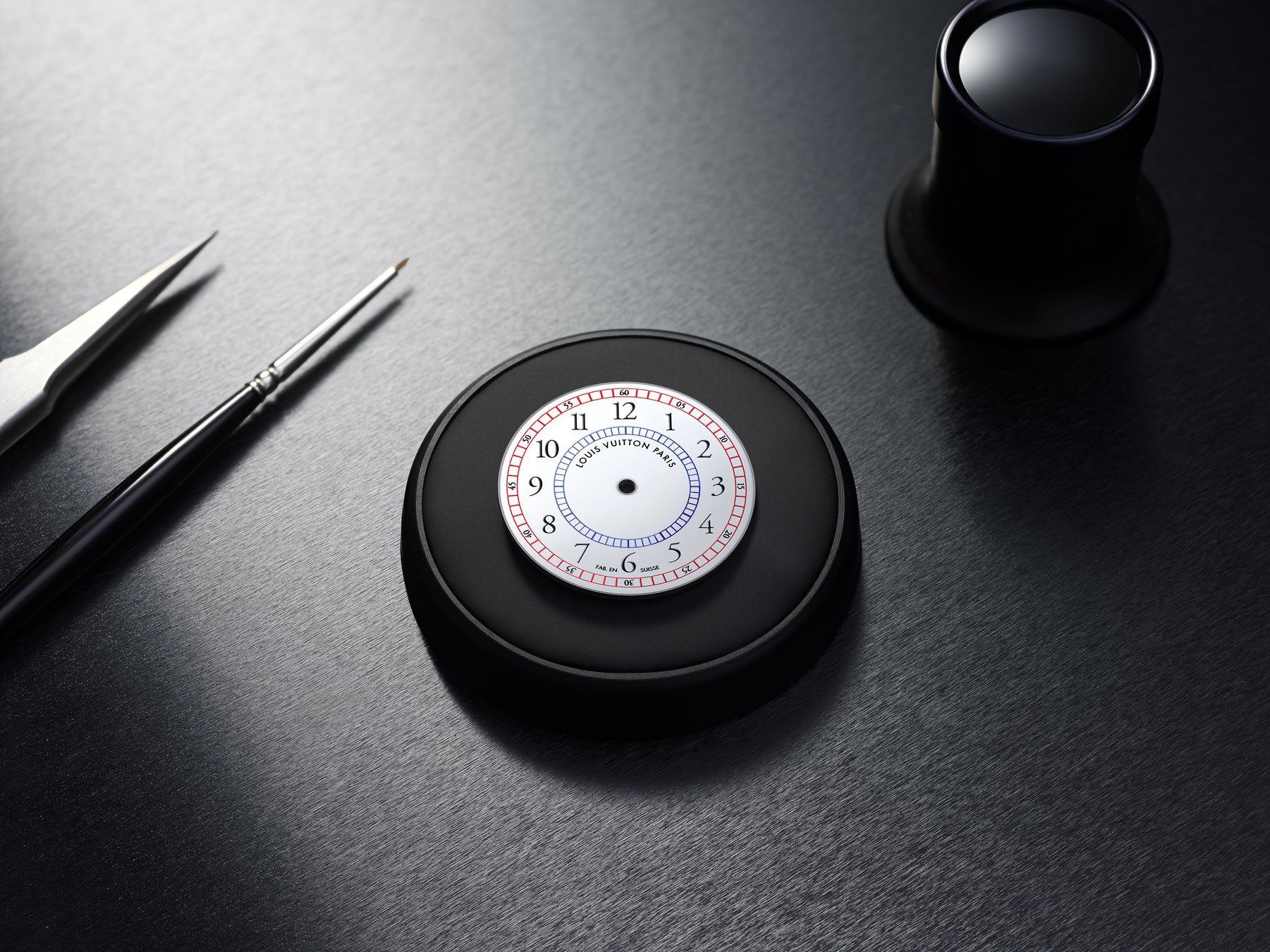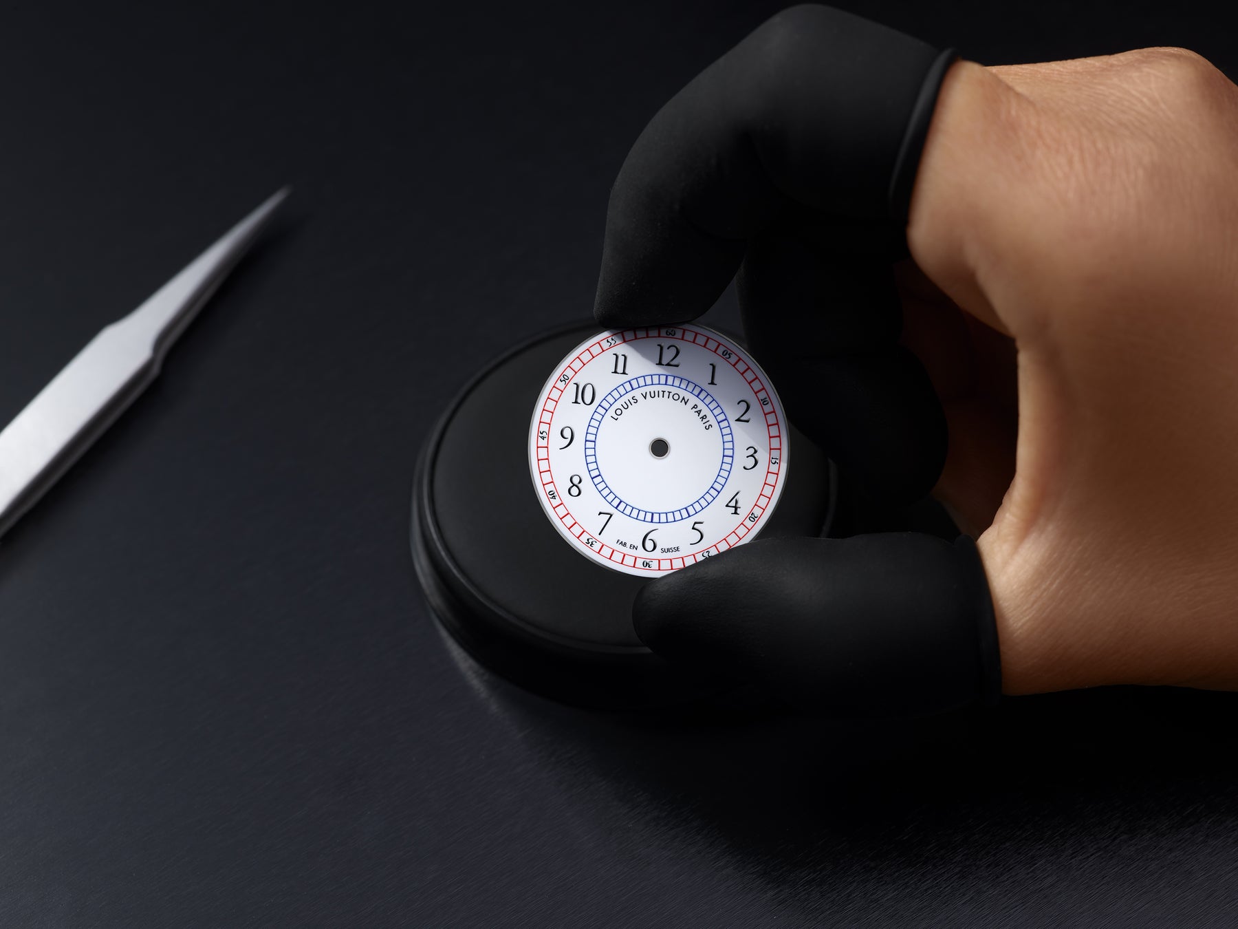 スタンピングプロセスは、ブルー、レッド、またはブラックの顔料を混ぜ合わせ、粉砕したエナメルパウダーのエッセンスを練り上げることからはじまります。こうして精密なエナメルスタンピングに理想的な、なめらかなペースト状の質感が生まれます。そしていよいよ、ダイヤルのシグネチャーを創り出すために、複雑なパターンや色調、希望の深みとボリュームを構築しながら、色ごとに精密な機械調整が行われる、2時間の工程がはじまります。各カラーにつき必要となるスタンプ工程は、460°Cで4回、その後600°Cで4回、合計8回にも及びます。ウォッチのホワイトゴールドの針にも反映されているダイヤルのカラーは、改めてオリジナルピースのコードを想起させ、エッジの効いたグラフィックなシリンジスタイルの針は、レッドのラッカーがアクセントとなり、ブルースティールの秒針と絶妙のハーモニーを奏でます。「FAB. EN SUISSE」と「LOUIS VUITTON PARIS」の2つのシグネチャーがダイヤルに個性を添えます。