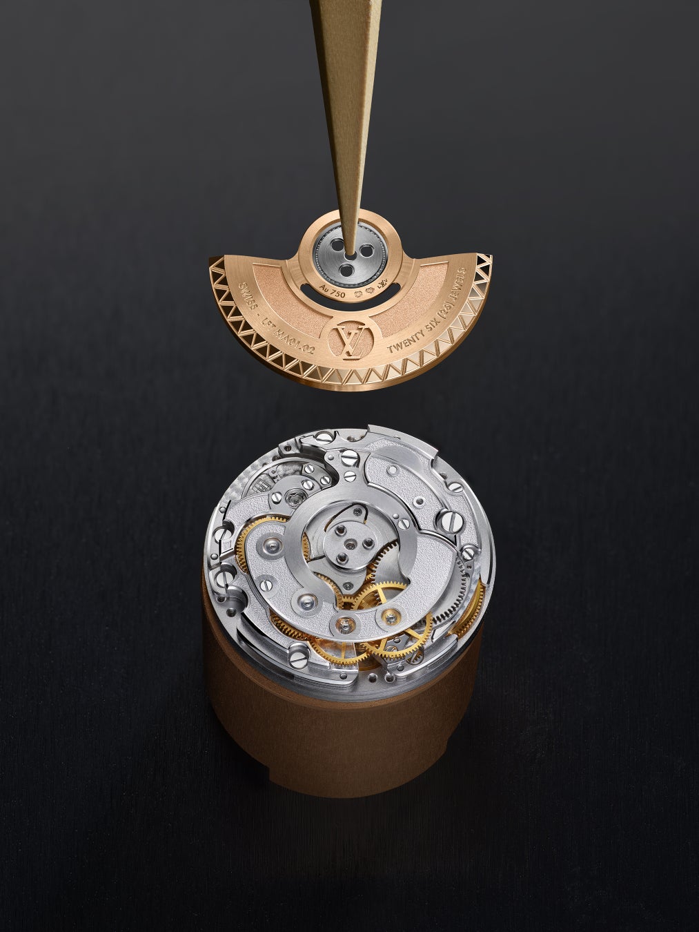 ケースのプロポーションは、クローズドケースバックの背後に収められた新しいウォッチの基盤となるLFT MA01.02自動巻きムーブメントと密接に結び付いています。「ラ·ファブリク·デュ·タン ルイ·ヴィトン」では、目に見えない部分も含め、キャリバーのあらゆるディテールが、丹精込めた職人技で仕上げられています。サーキュラーグレイン仕上げのメインプレート、サンドブラスト加工のブリッジ、あるいはマイクロサンドブラスト加工のエッジなど、ウォッチの内部は、外観と同じレベルの精度と職人技が光ります。また、メゾンのモノグラムを連想させるV字型の切り込みを施した18Kローズゴールド製のローターなど、メゾンを象徴するデザインコードも採用。バレル下には、「ラ·ファブリク·デュ·タン ルイ·ヴィトン」の品質の証である「LFT」の刻印が控えめに施されています。最後に、現代のライフスタイルに合わせて28,800振動 / 時と45時間のパワーリザーブを備えたキャリバーに、カラーレスサファイアがモダンな印象を添えています。