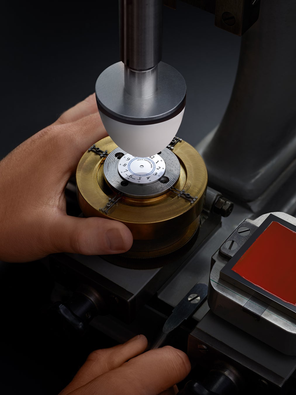 次の仕上げ工程では、まず文字盤をグラスペーパーで研磨して完璧に平らな表面を作り、エナメルのガラス化に備えてホワイトの文字盤の準備を整えます。ここでは、文字盤を720°Cでゆっくりと焼成するという工程を10回繰り返します。これにより、単に堅牢で透明な層だけでなく、オパールのような効果を放つ特別な光沢感と輝きが生まれます。この独特の豊かさと深みは、手作業によるエナメル塗布の技法でしか実現することはできません。