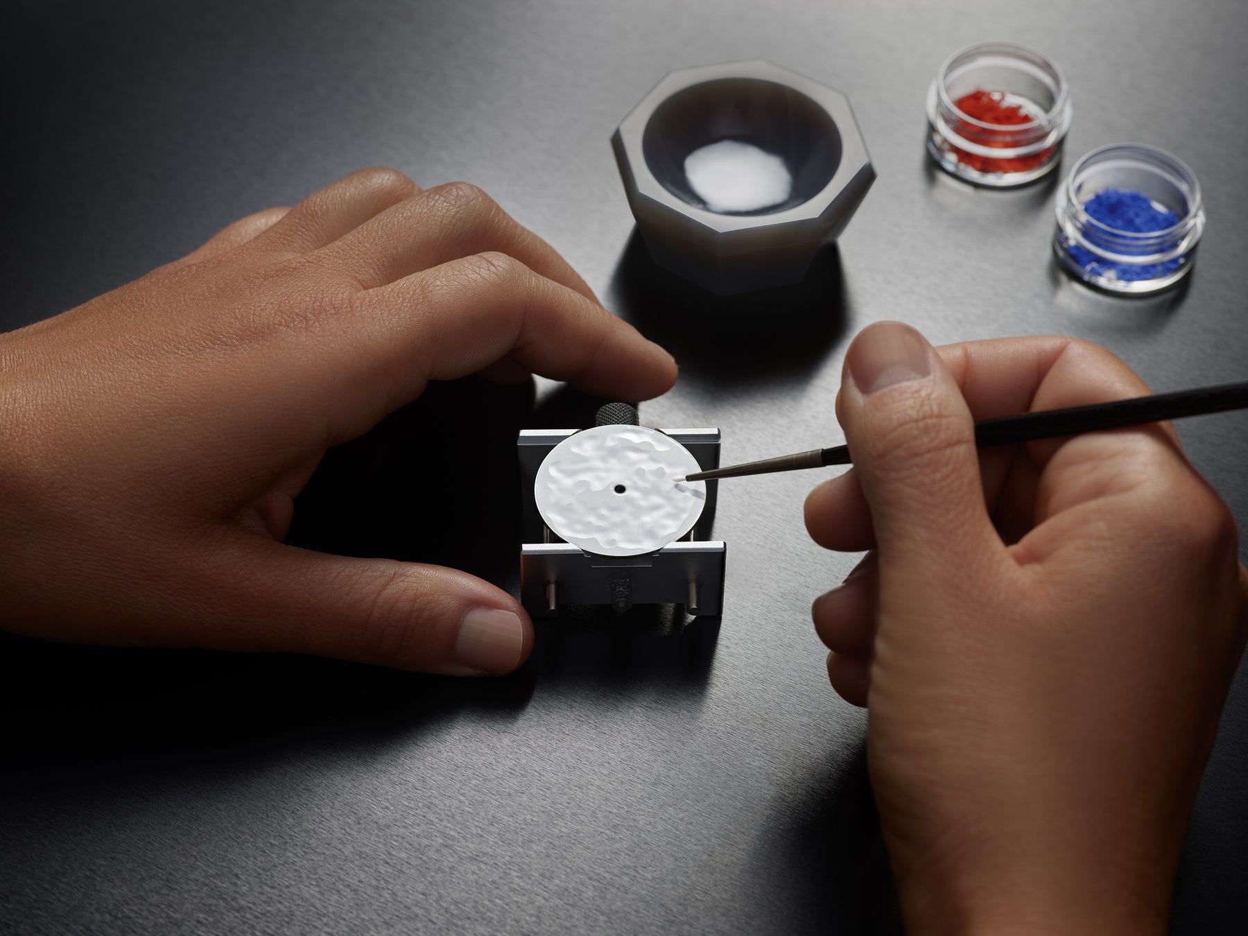 またホワイトは、完璧に仕上げるのが最も難しい色合いの1つでもあります。プロセスは、繊細で均一なテクスチャーを確保するため、顕微鏡を使ってエナメルパウダーに不純物がないかを検査する色調調整からはじまります。その後、ファイバーグラスで下地処理を施したホワイトゴールドのダイヤルベースに、極細のブラシを使って手作業でエナメルを塗布していきますが、希望のカラーと色調を実現するには入念なレイヤリングが必要となります。まず薄いベース層を作り、焼成後、さらに4層の重ね塗りを繰り返し、その都度焼成を挟むことで、望ましい深みと不透明度が達成されるのです。過焼成や焼成不足を避け、なめらかで均一な色調を確保するためには、熟練したタイミング管理が重要になります。